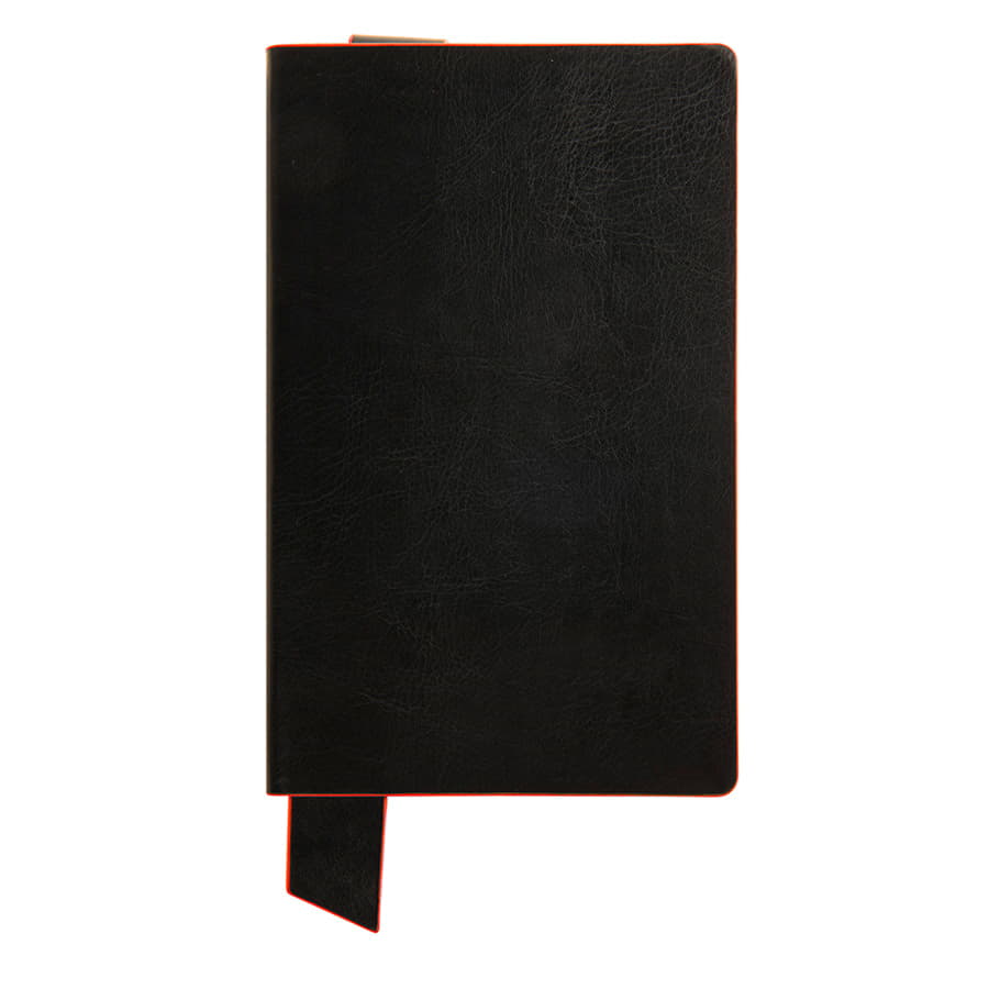 Размер блокнота 130*210 мм. Имитирующая натуральную кожу мягкая PU обложка Bondy черного цвета по краям имеет яркую цветовую отделку. Широкая закладка из аналогичного PU также контрастно окрашена по краям. Форзац и нахзац в тон цветному канту обложки. Цвет форзаца нахзаца и отделки обложки близок к pantone 2035C. Внутренний блок 256 страниц в линейку. Идеально скругленные углы блока. Перфорированные 8 последних листов. Кремовая eco-friendly FSC бумага 70 г м2. Карман для записок в тон нахзаца. -