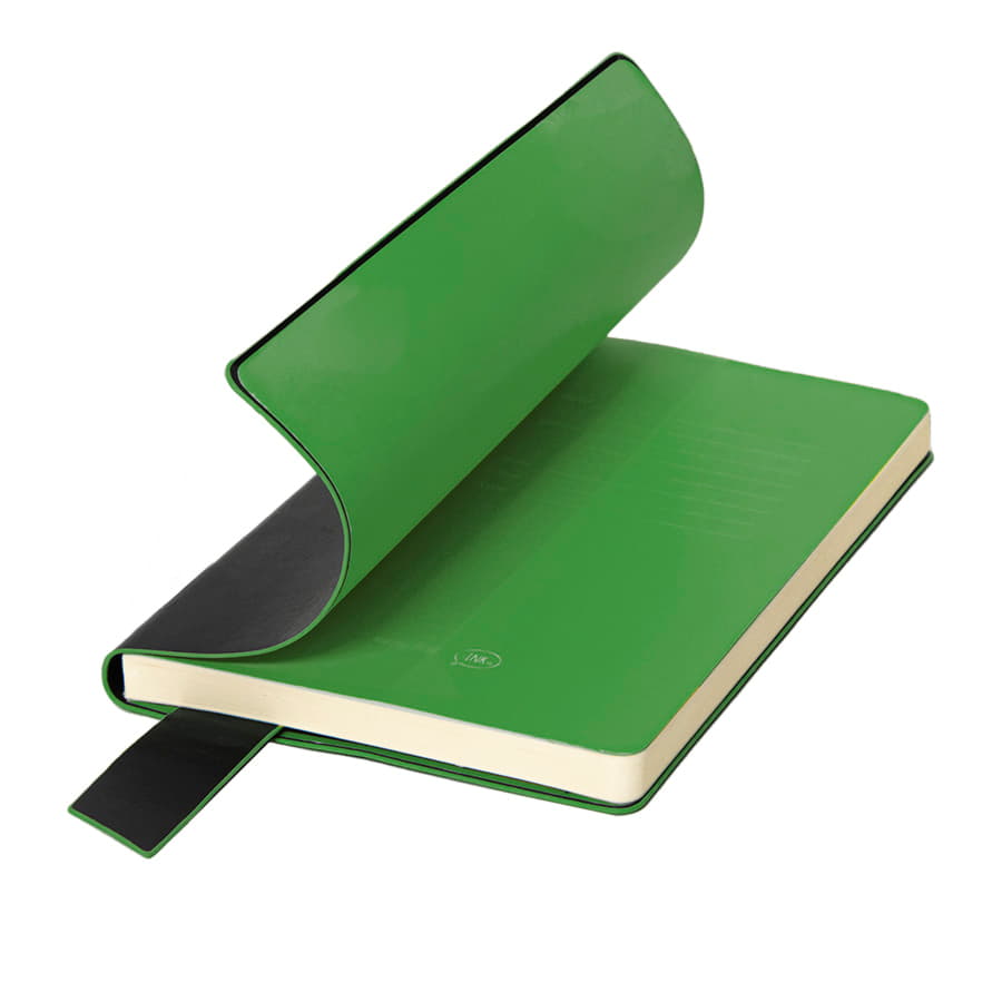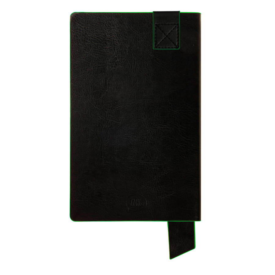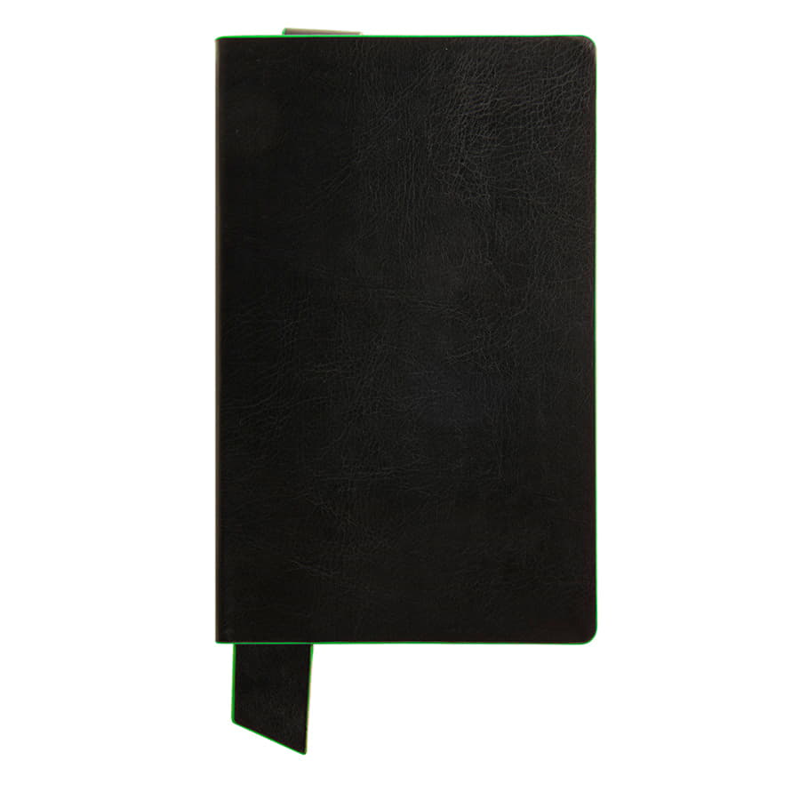 Размер блокнота 130*210 мм.  Имитирующая натуральную кожу мягкая PU обложка Bondy черного цвета по краям имеет яркую цветовую отделку.  Широкая закладка из аналогичного PU также контрастно окрашена по краям.  Форзац и нахзац в тон цветному канту обложки.  Цвет форзаца нахзаца и отделки обложки близок к pantone 2426C.  Внутренний блок 256 страниц в линейку.  Идеально скругленные углы блока.  Перфорированные 8 последних листов.  Кремовая eco-friendly FSC бумага 70 г м2.  Карман для записок в тон нахзаца.