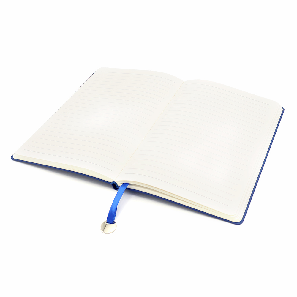 Блокнот формата А5 в гибкой обложке из искусственной кожи. Материал обложки — полиуретан. Ляссе и каптал блокнота соответствует цвету обложки. На конце ляссе присутствует металлический жетон, куда можно заказать гравировку логотипа организации. Размеры: 210*147*13 мм, 256 страниц / 128 листов, страницы в линейку, плотность бумаги — 70г/м2.- Виды нанесений: УФ-печать А2, Гравировка А2, Тиснение, Тиснение фольгой, УФ-Лак, УФ-Цвет+Лак