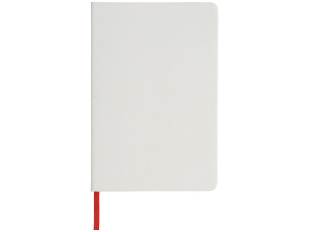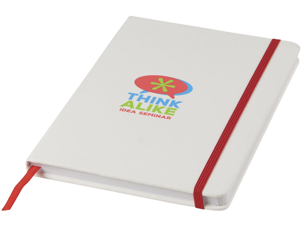 Белый блокнот A5 с цветной эластичной закладкой и резинкой. 96 страниц (60g/m2), линованная бумага. На обложке возможна цифровая печать. -