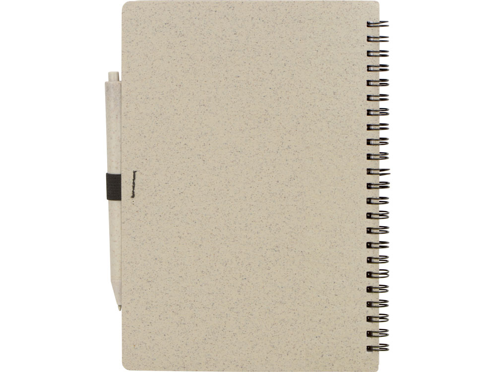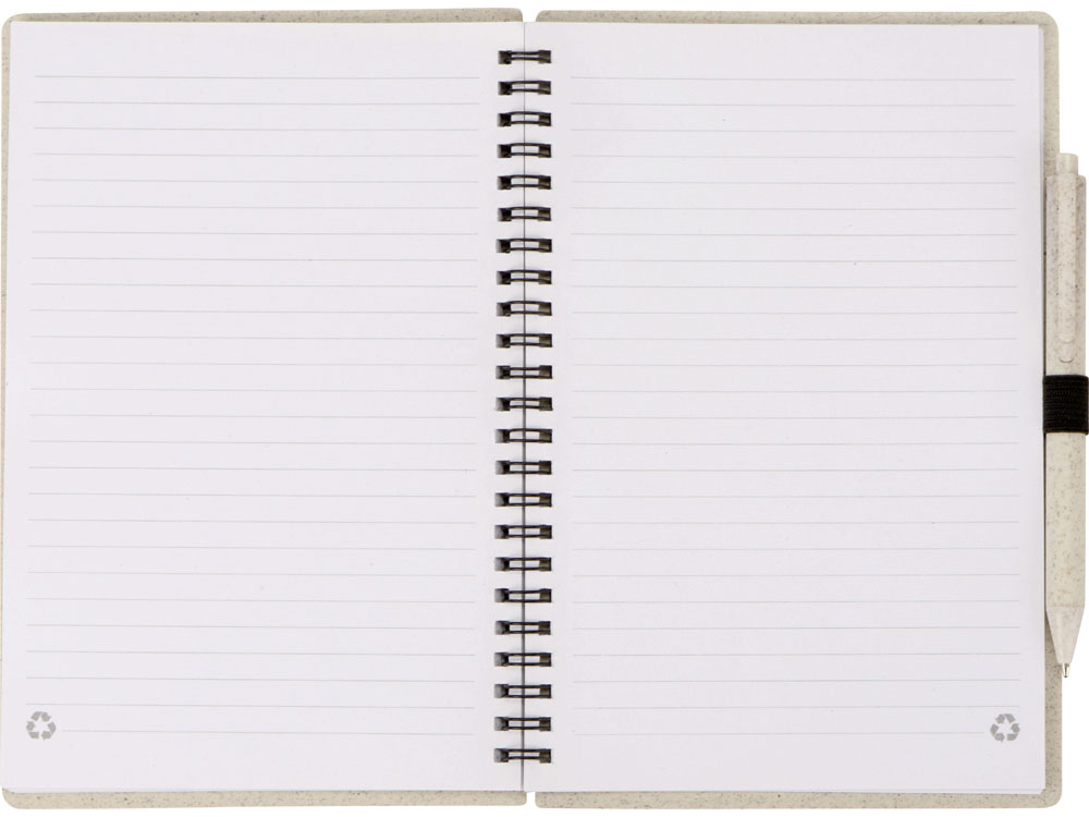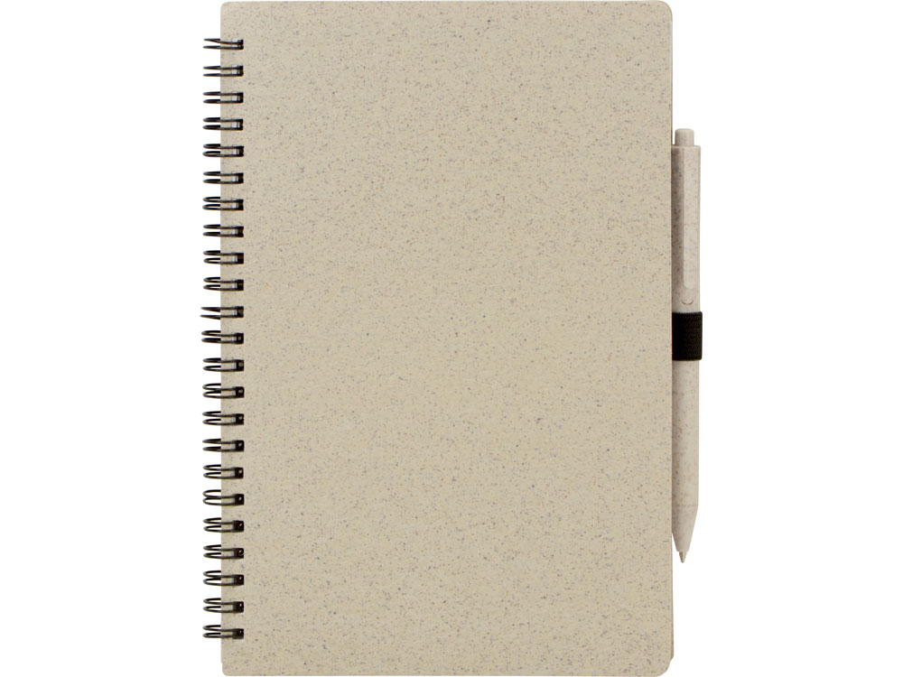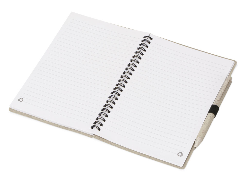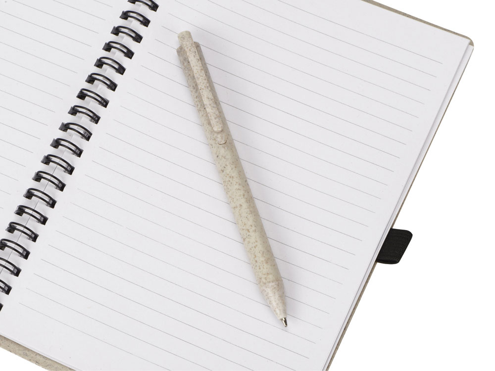 Блокнот с обложкой из переработанной пшеницы и пластика. Блок состоит из 80 листов переработанной бумаги белого цвета. Крепление - пружина. В комплекте шариковая ручка в тон блокноту из пшеничной соломы. -
