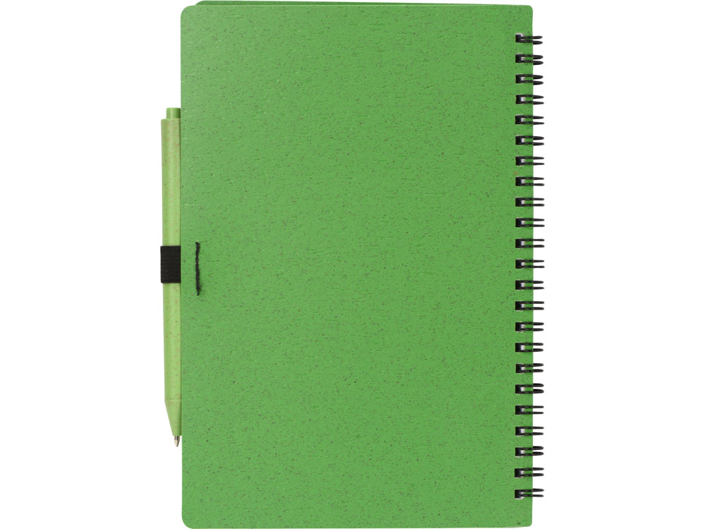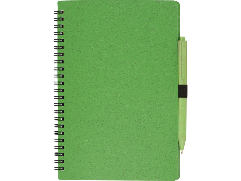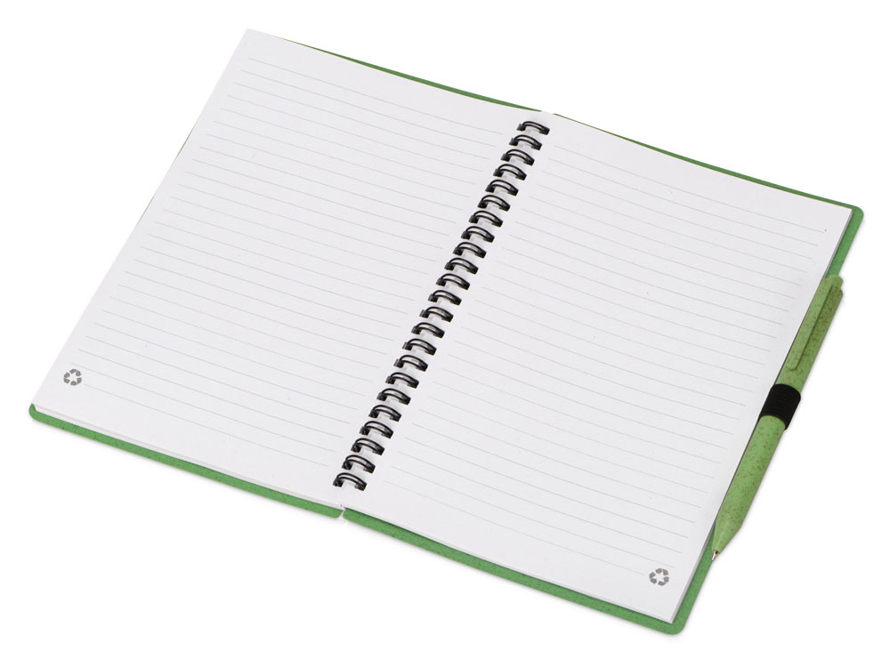 Блокнот с обложкой из переработанной пшеницы и пластика. Блок состоит из 80 листов переработанной бумаги белого цвета. Крепление - пружина. В комплекте шариковая ручка в тон блокноту из пшеничной соломы. -