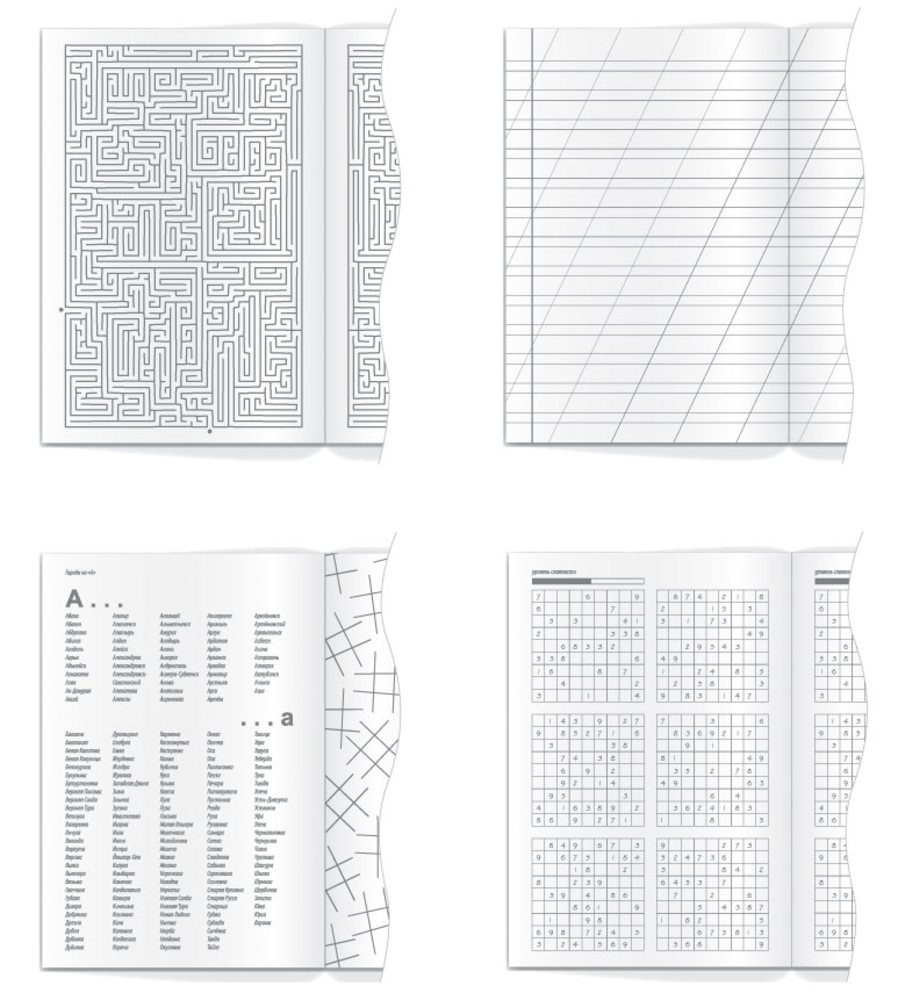 Суровая обложка в стиле industrial скрывает страницы весьма нестандартного блокнота-ежедневника. Внутри — страницы, разлинованные всеми возможными способами; чистые листы и классический набор «бумажных» игр: от морского боя до судоку, а также «листы гнева».