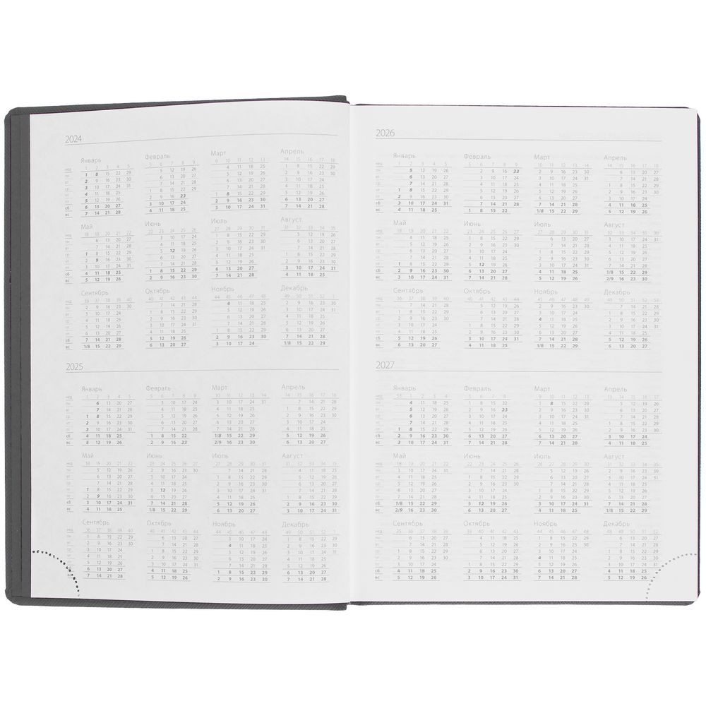 Твердая обложка выполнена из материалов Nice Touch, черный АА, и Canyon, фиолетовый UU. Ежедневник дополнен капталом, резинкой для ручки и ляссе черного цвета.Блок 922, с информационным блоком: