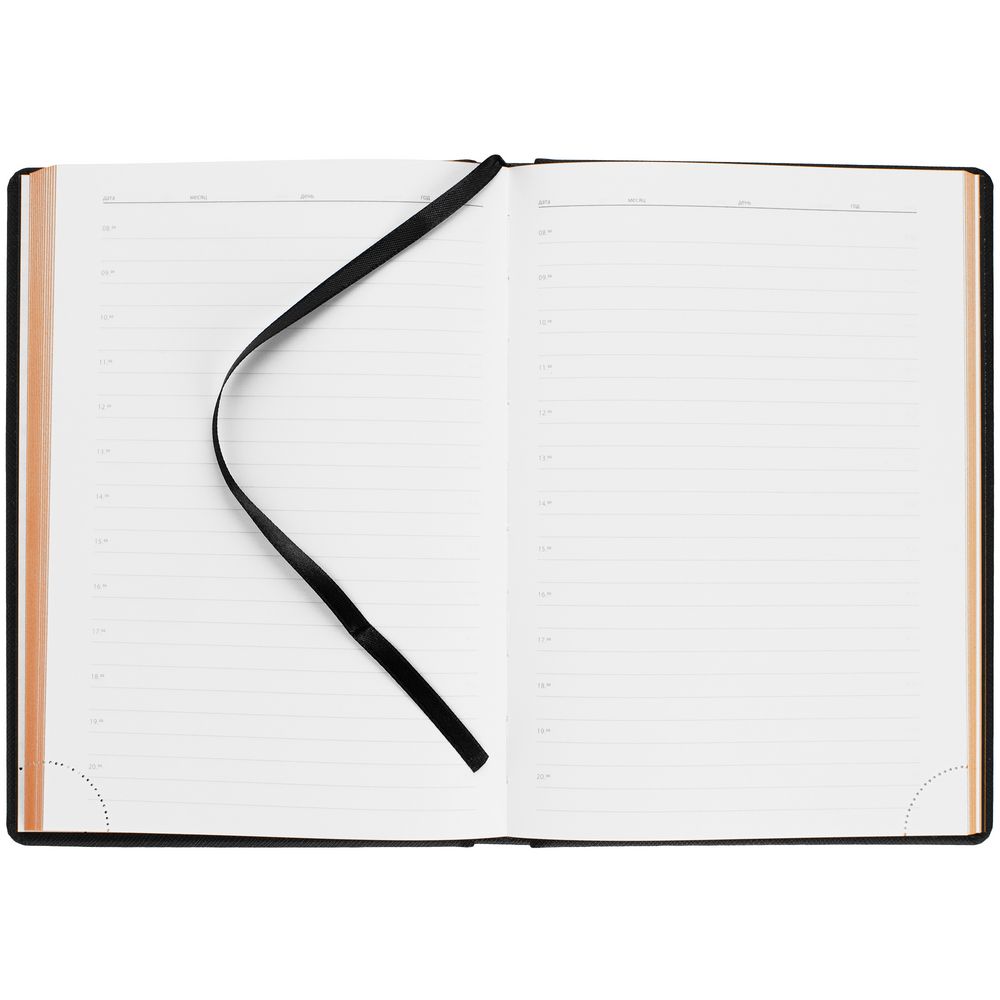 Твердая обложка выполнена из материалов Nice Touch, черный АА, и Canyon, оранжевый ОО. Ежедневник дополнен капталом, резинкой для ручки и ляссе черного цвета.Блок 922, с информационным блоком: