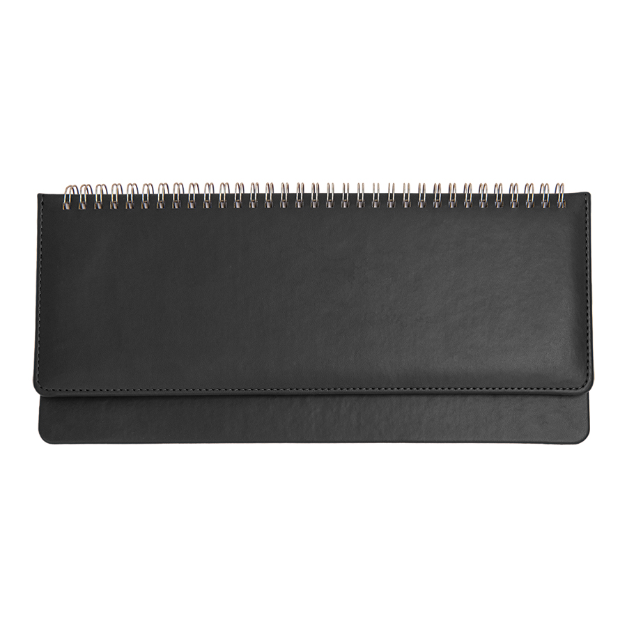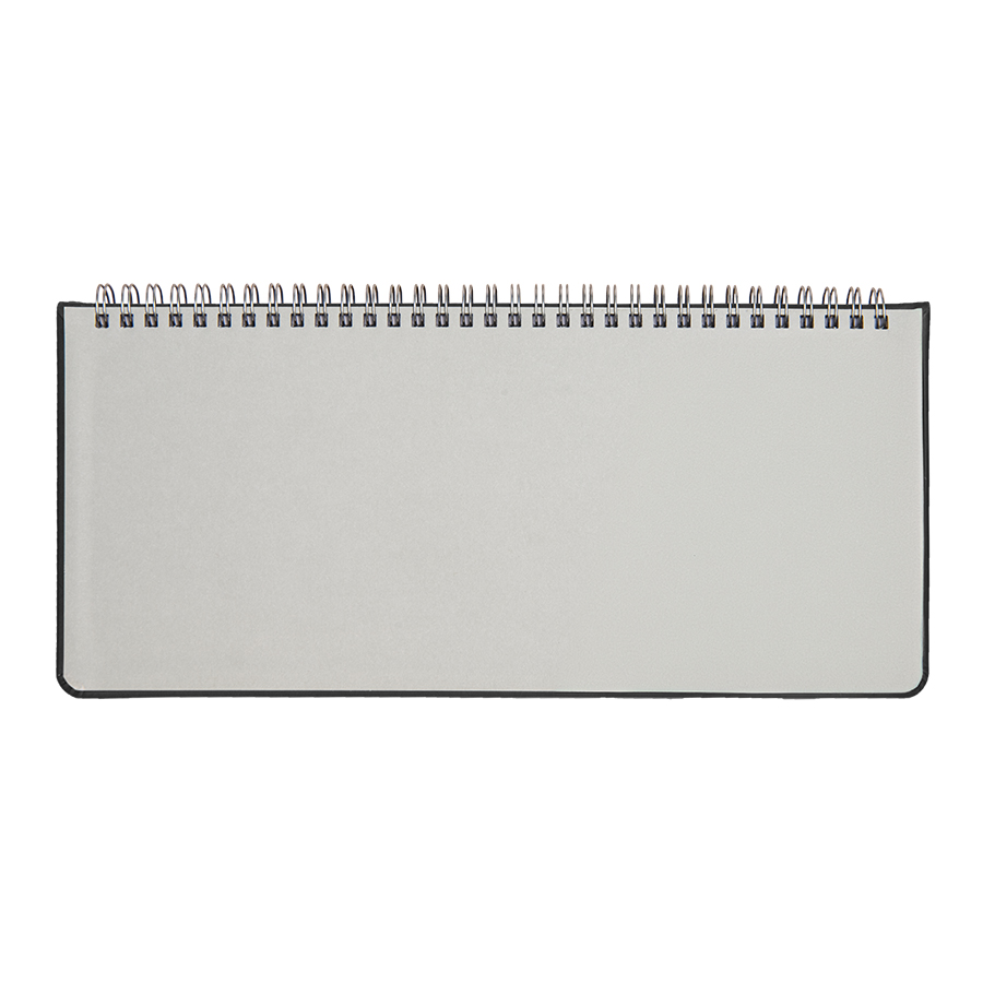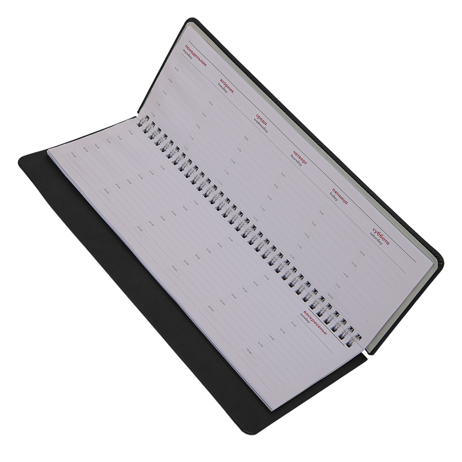 Цвет обложки, близкий к пантону Black C Размер 140*300 мм Переплет твердый, на металлической спирали, прошивка по периметру верхней обложки Обложка PU Velvet Блок недатированный, в линейку, прямые углы Бумага белая, плотность 70 г м2 Форзац нахзац серые 128 страниц Упаковка крафтовый сливбоксВ данный момент происходит смена справочной части блока. Внешний вид изделия остается без изменений. -