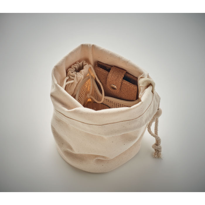 Небольшая сумка-мешок для аксессуаров из органического хлопка. 220 гр/м². Имеет внутренние сетчатые отделения и деревянную застежку. -