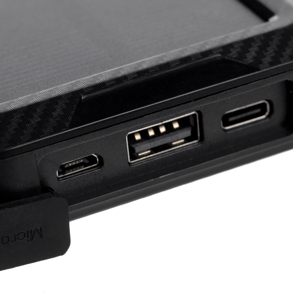 Прорезиненные вставки и рисунок на корпусе с имитацией карбона добавляют хорошей агрессивности внешнему виду аккумулятора — сразу видно, что его хозяин готов к приключениям.
