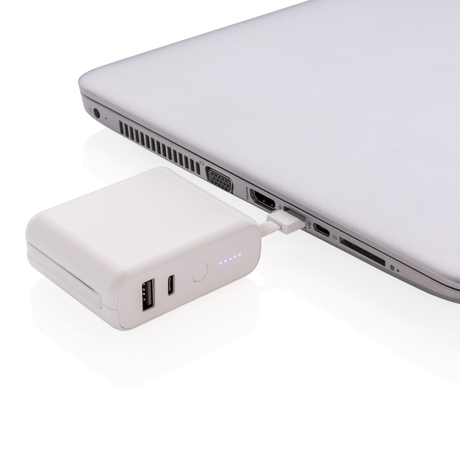 Аккумулятор белого цвета c 5 светодиодными индикаторами, упакован в коробку XD collection.