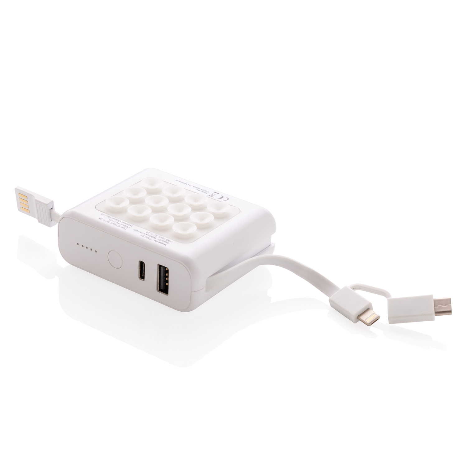 Этот внешний аккумулятор с функцией беспроводной зарядки оснащен встроенной литий-ионной батареей на 5 000 мАч и 3 в 1 кабелем для любых iOS и Android девайсов. Поместите свой телефон на присоску и заряжайте его с помощью кабеля или беспроводным путем. Беспроводная зарядка совместима с Android последнего поколения, iPhone 8 или выше. Напряжение на входе USB: 5V/2.A, на входе Type-C: 5V/2.A. Выход беспроводного напряжения: 5V/1A; USB напряжение на выходе: 5V/1A