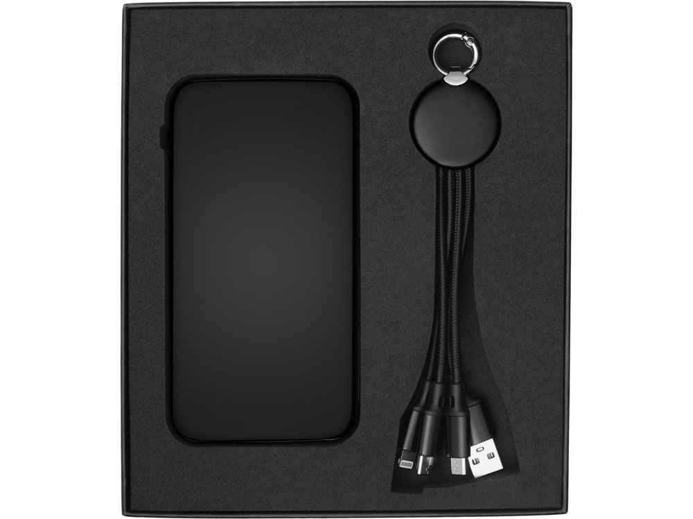 Практичный и стильный набор для зарядки в дороге: внешний аккумулятор на 10 000 мА·ч и универсальный кабель с тремя разъёмами (Micro USB, Lightning, USB Type-C). Оба элемента комплекта оснащены подсветкой логотипа — ваш бренд всегда на виду, даже в темноте. Повербанк обеспечивает 2–3 полных заряда смартфона и оснащён двумя выходами (USB-A и USB-C) для одновременной зарядки двух устройств. Поставляется в прочной подарочной коробке с шубером — идеальное решение для корпоративных подарков.