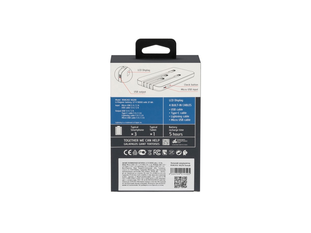 Литий-полимерный внешний аккумулятор емкостью 10000 мАч. Цифровой дисплей показывает уровень заряда. Защита от перегрузок, короткого замыкания, чрезмерного заряда и разряда. Автоматическое включение/выключение. Достаточно подключить кабель к разъему мобильного устройства и начнется заряд. Сквозной заряд - можно одновременно заряжать телефон и сам аккумулятор. Количество зарядов смартфона до 3 раз. (Зависит от емкости аккумулятора смартфона). ОСНОВНЫЕ ПРЕИМУЩЕСТВА: 4 встроенных кабеля - не надо искать подходящий кабель для Вашего телефона! Цифровой дисплей. Сквозной заряд. -