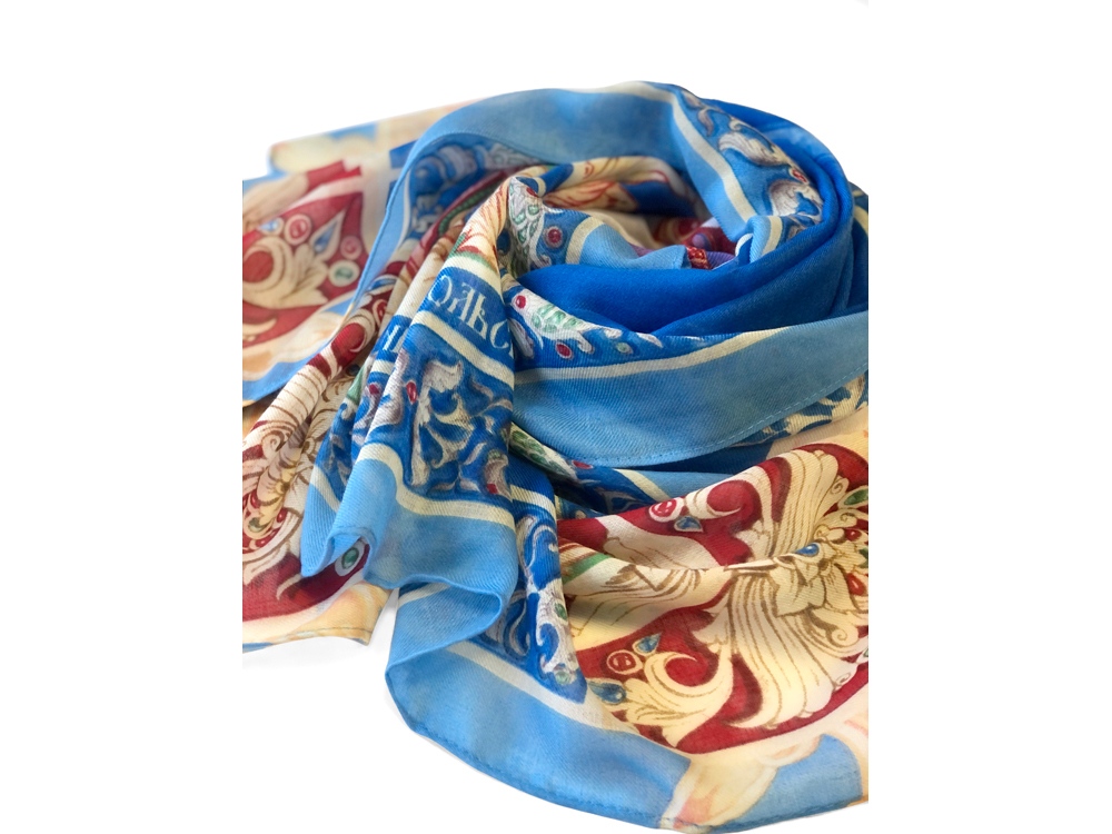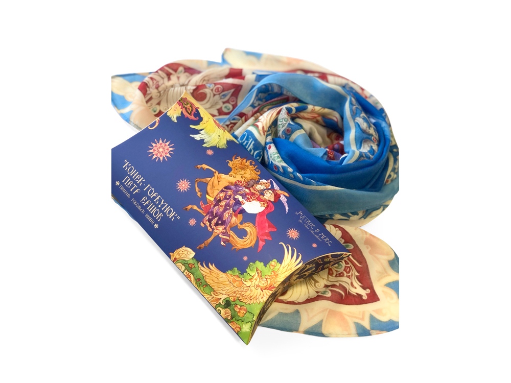 Прочитав сказку юного дарования, сам великий Александр Сергеевич Пушкин сказал: Этот род сочинений я могу теперь оставить - и Петр Ершов был принят в круг петербургских писателей.В этом году сказке из золотого фонда русской литературы, переведенной на все языки мира, исполняется 185 лет. Ее яркие краски мы перенесли на шелк и создали платок Конек-Горбунок. Благодаря тонкой работе дизайнера, со страниц книги, как живые, сошли герои любимой с детства истории: Иван, прекрасная Царь-девица и волшебный Конек-Горбунок. А в роскошных орнаментах сплелись легендарное перо Жар-птицы, Красное Солнышко и Месяц…