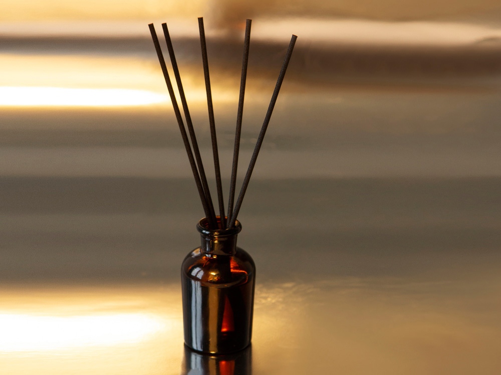 Объём диффузора 50 мл. Его будет достаточно для умеренного поддержания аромата в комнате до 15м2 в течение двух месяцев использования. Насыщенность аромата регулируется количеством используемых фибровых палочек.