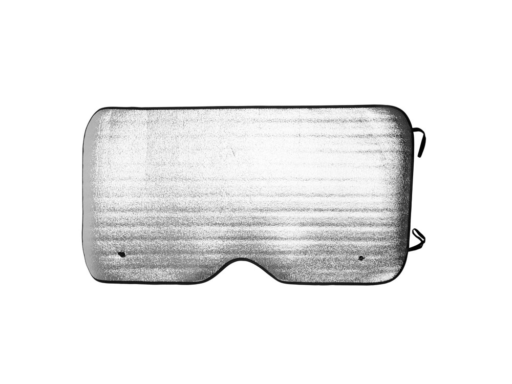 Прямоугольный автомобильный солнцезащитный козырек с алюминиевой передней частью и белой пенопластовой задней частью. Два металлических люверса в обоих верхних углах для присосок. Черная окантовка и эластичные лямки для складывания. -