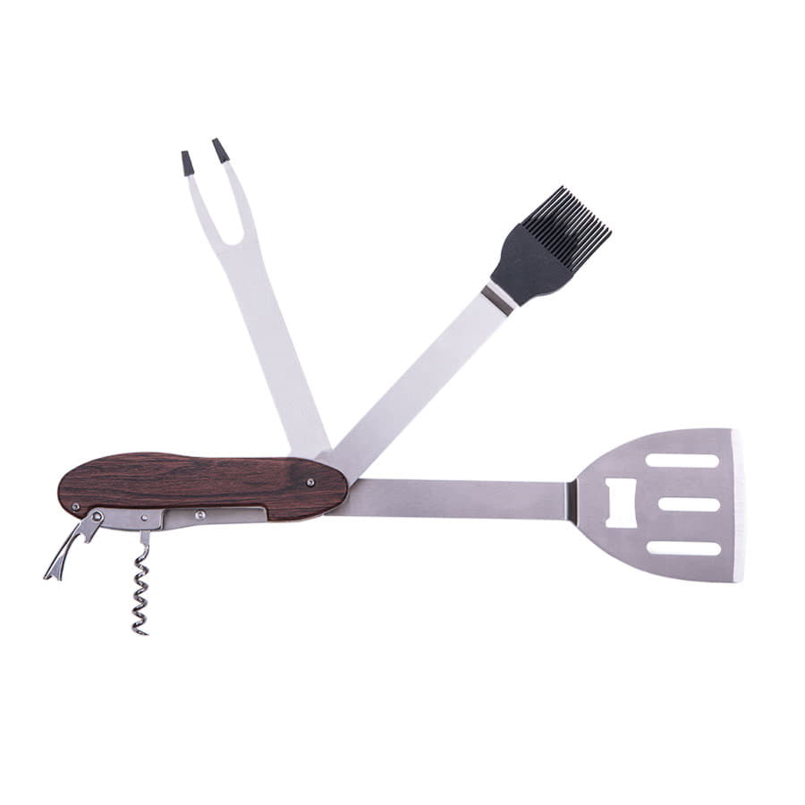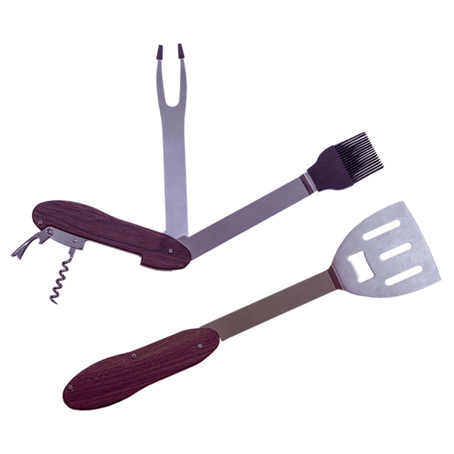 Мультисет для барбекю, 5 функций: 1. Лопатка 2. Вилка для барбекю 3. Силиконовая кулинарная кисть 4. Штопор 5. Открывалка для бутылок Барбекю сет скреплен магнитами в основании ручки, разделив их Вы получите два полноценных инструмента для приготовления блюд. Поставляется в индивидуальной коробке с прозрачным окном и плотным ложементом. -
