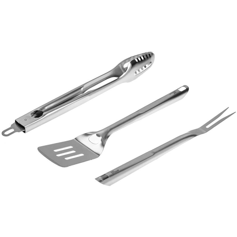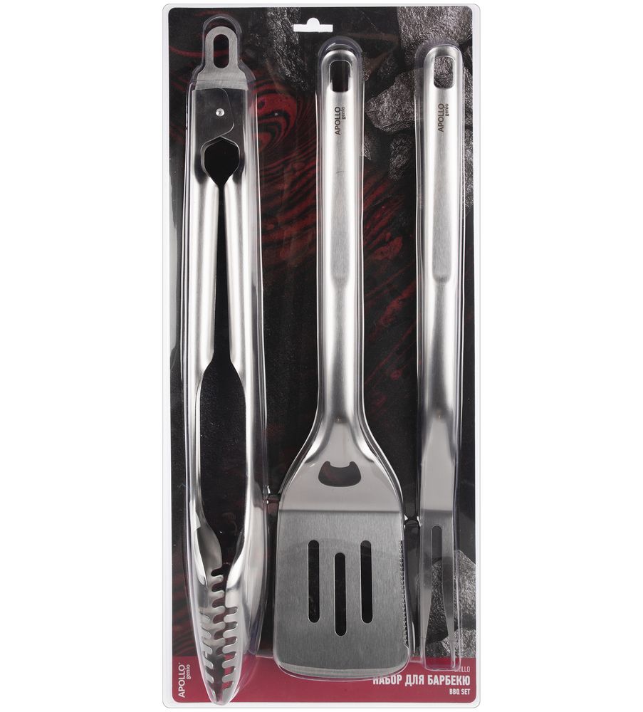 С помощью вилки удобно поднимать и переворачивать мелкие кусочки продуктов. Прорези на лопатке позволяют стекать излишкам масла, соуса или жидкостей. Щипцы предназначены для переворачивания продуктов на гриле, мангале или жаровне.