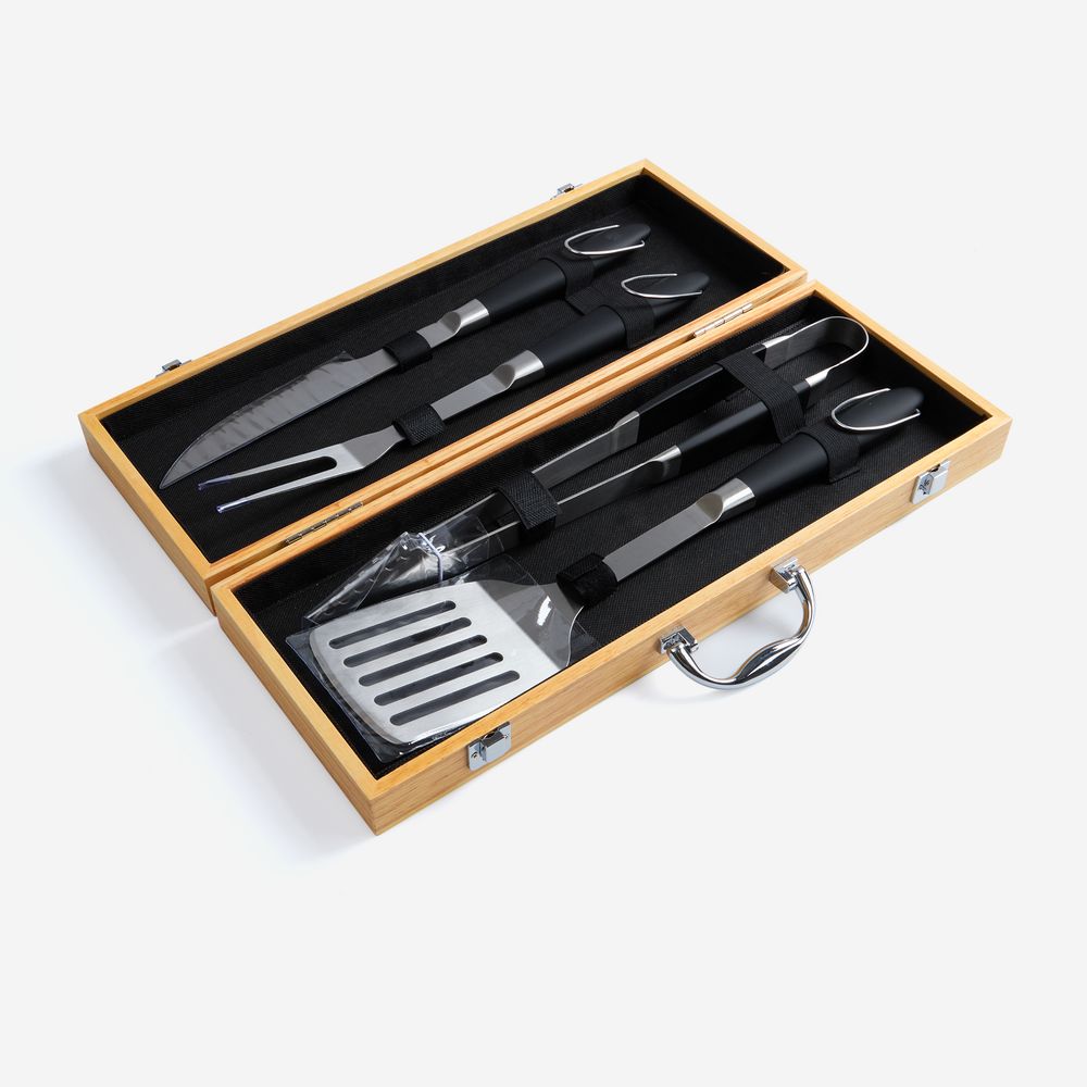 Стильный деревянный кейс не только защищает инструменты при хранении, но и позволяет легко транспортировать набор куда угодно — в загородный дом, ближайший парк или на природу.В набор входят: щипцы, вилка, лопатка и нож.