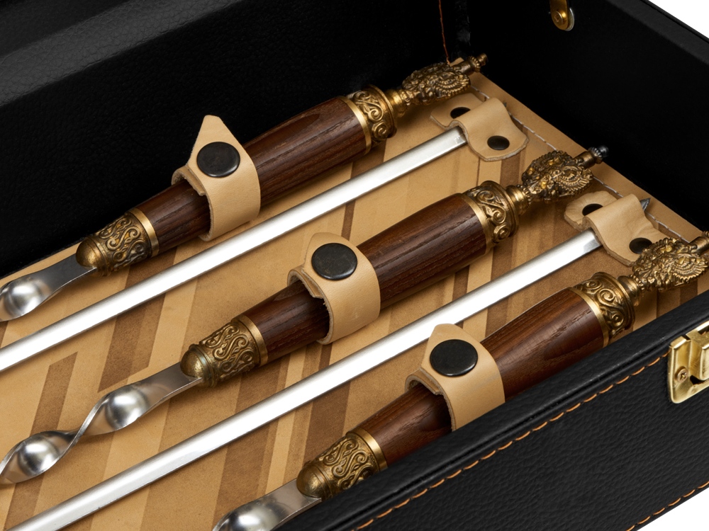 стопки- хрусталь/литье, шампура- нержавеющая столь/дерево, дипломат- сплит кожа