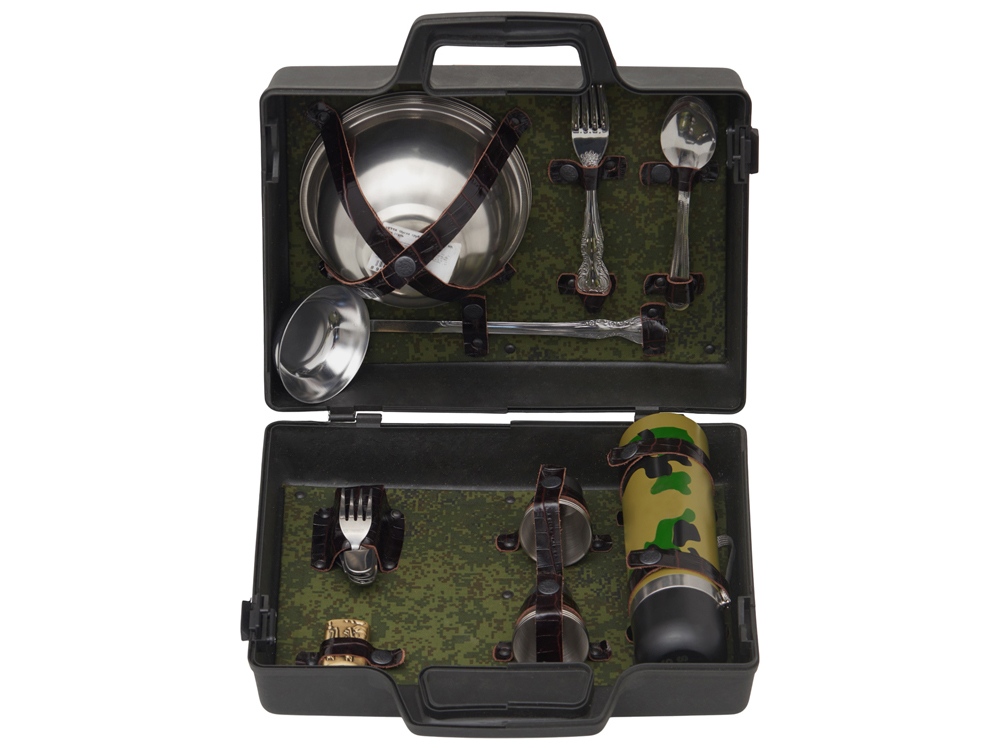 Все элементы набора выполнены из качественной нержавеющей стали, что обеспечивает долговечность и легкость в уходе. Упакованы в пластиковый кейс и надежно закреплены ремешками из натуральной кожи, что обеспечивает удобство транспортировки и сохранность содержимого. -