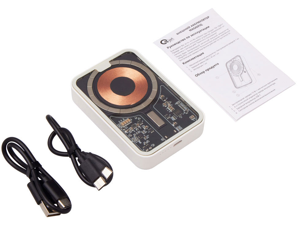 Беспроводной магнитный внешний аккумулятор MagnifIQ — технологичный и стильный power bank с эффектной прозрачной передней панелью, сквозь которую видны мощные магниты, индукционная катушка и электронная начинка. Ёмкость 10 000 мА·ч обеспечивает до 2–3 полных зарядов смартфона, а поддержка быстрой беспроводной зарядки до 15 Вт (с совместимостью QC/PD) делает процесс зарядки максимально быстрым и удобным. Двунаправленный USB-C порт позволяет как заряжать другие устройства, так и сам аккумулятор. Обе стороны корпуса подходят для нанесения логотипа: лицевая — через прозрачную панель, задняя — на приятное на ощупь soft-touch покрытие. Компактный, надёжный и сильный — идеальный технологичный продукт для продвижения и ежедневного использования. Поставляется в качественной упаковке с шубером, Двунаправленный кабель USB-C и кабель USB-A – USB-C в комплекте.