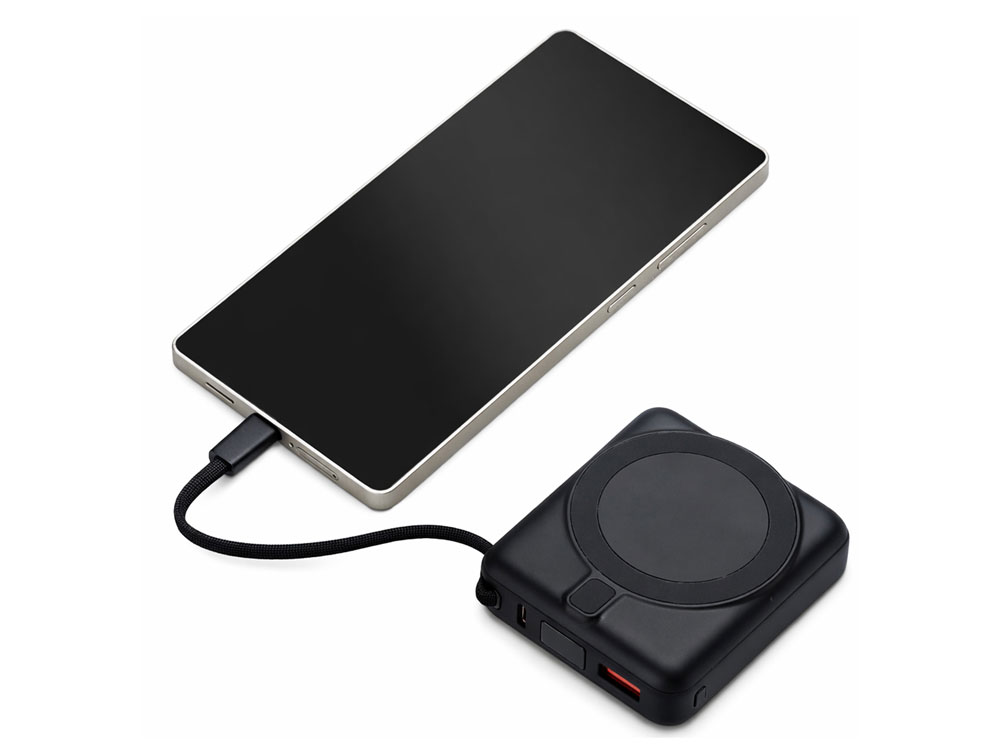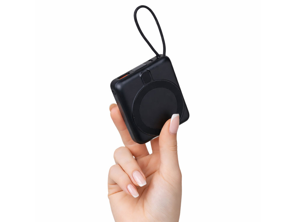 Магнитный пауэрбанк с эффектными возможностями брендирования. Компактный беспроводной аккумулятор с магнитным креплением MagSafe — идеальный корпоративный подарок для клиентов и партнеров. Уникальная особенность: логотип с подсветкой виден даже когда пауэрбанк прикреплен к телефону. Встроенный двусторонний USB-C кабель устраняет необходимость носить дополнительные провода — заряжайте устройства и сам аккумулятор одним кабелем.