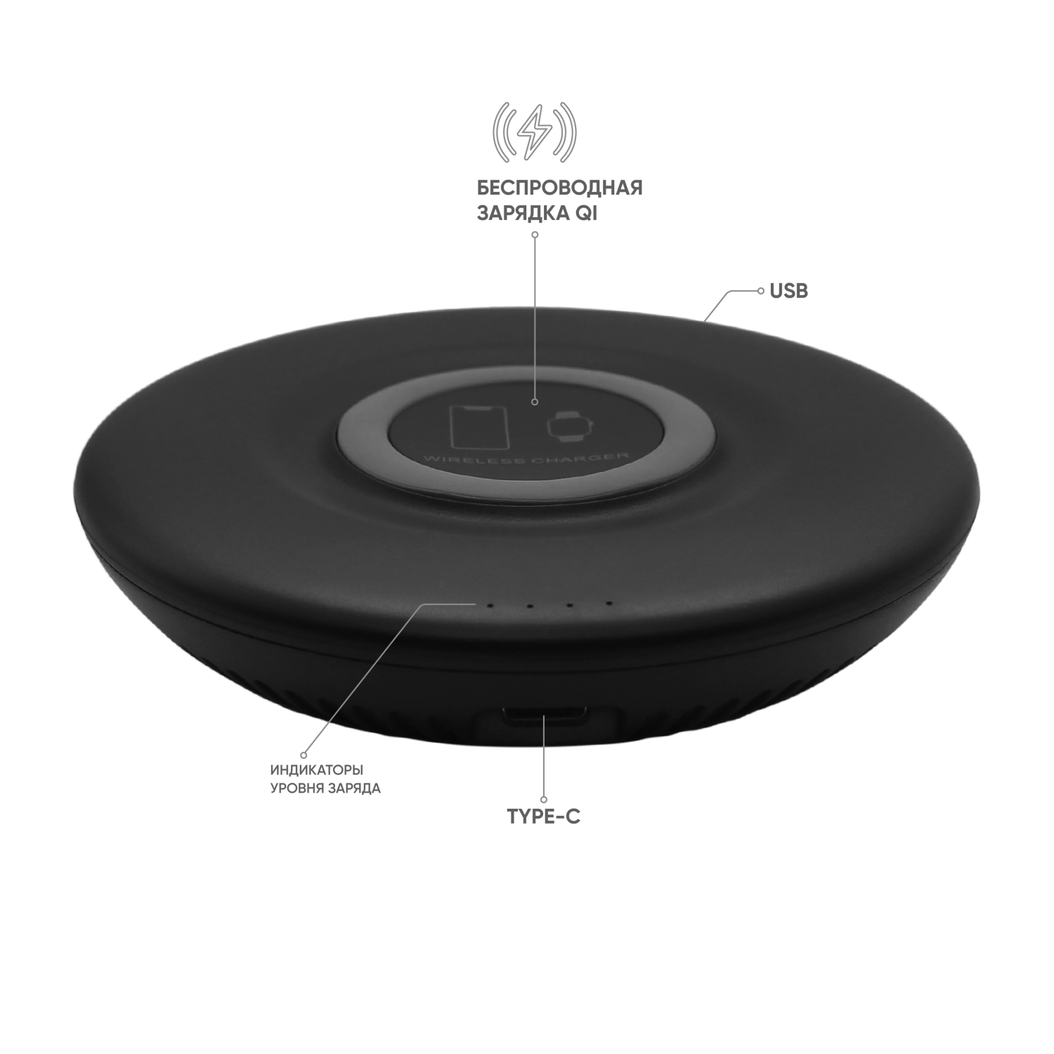 Внешний аккумулятор емкостью 5000 мАч с функцией беспроводной зарядки по стандарту Qi - зарядное устройство для часов iWatch и смартфонов iPhone. Оно позволяет легко и быстро заряжать мобильные устройства, находясь на прогулке или на работе.