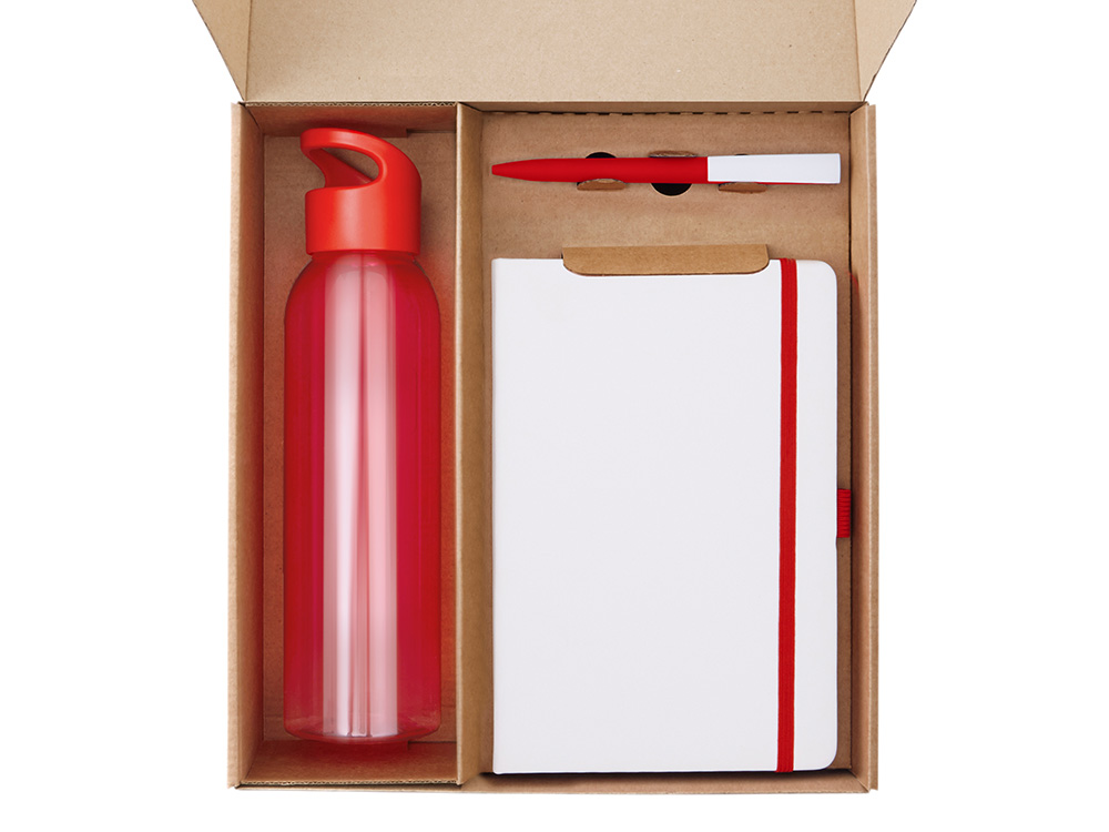 бутылка -поликарбонат, блокнот - искусственная кожа, бумага, ручка - пластик с покрытием soft-touch, держатель - пластик, ланчбокс - пластик, открытка - картон, коробка - картон