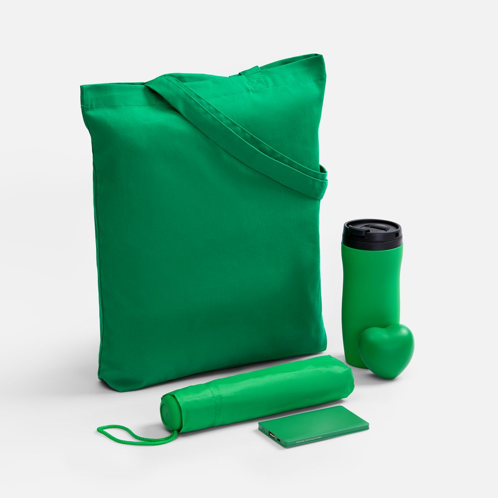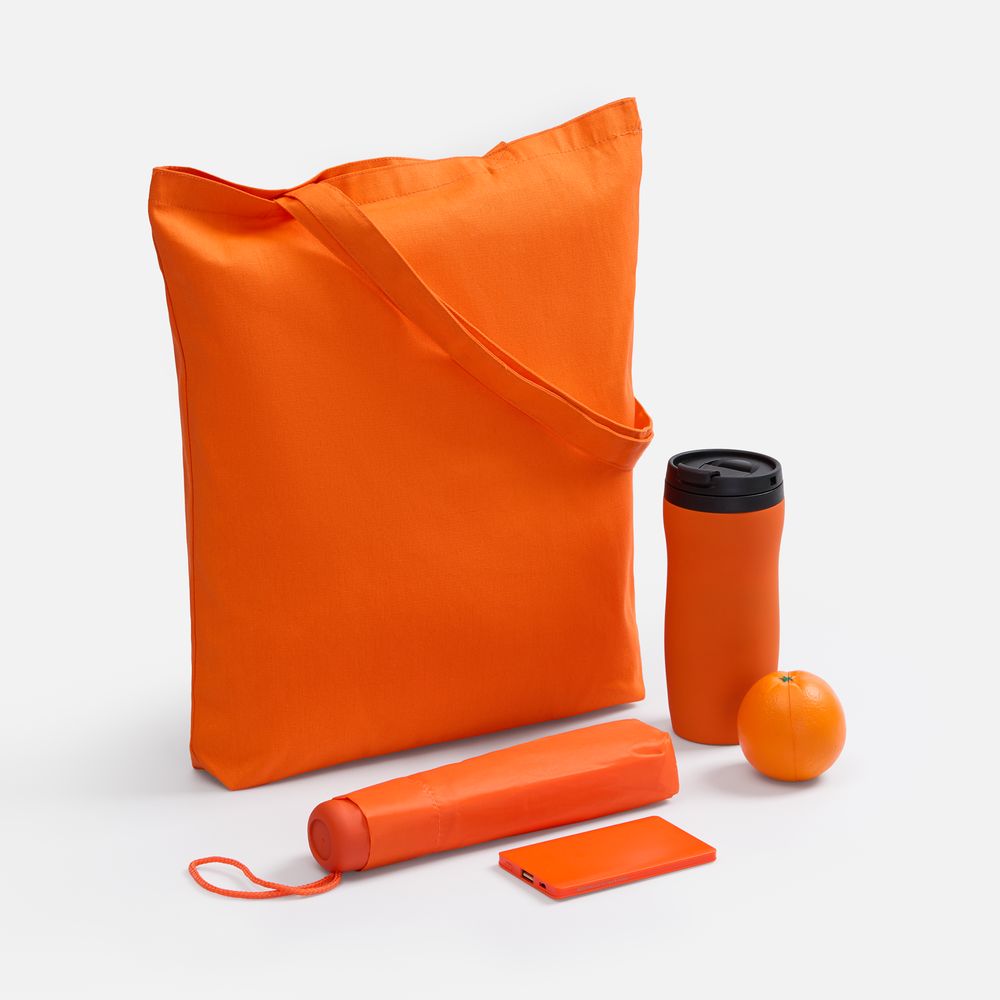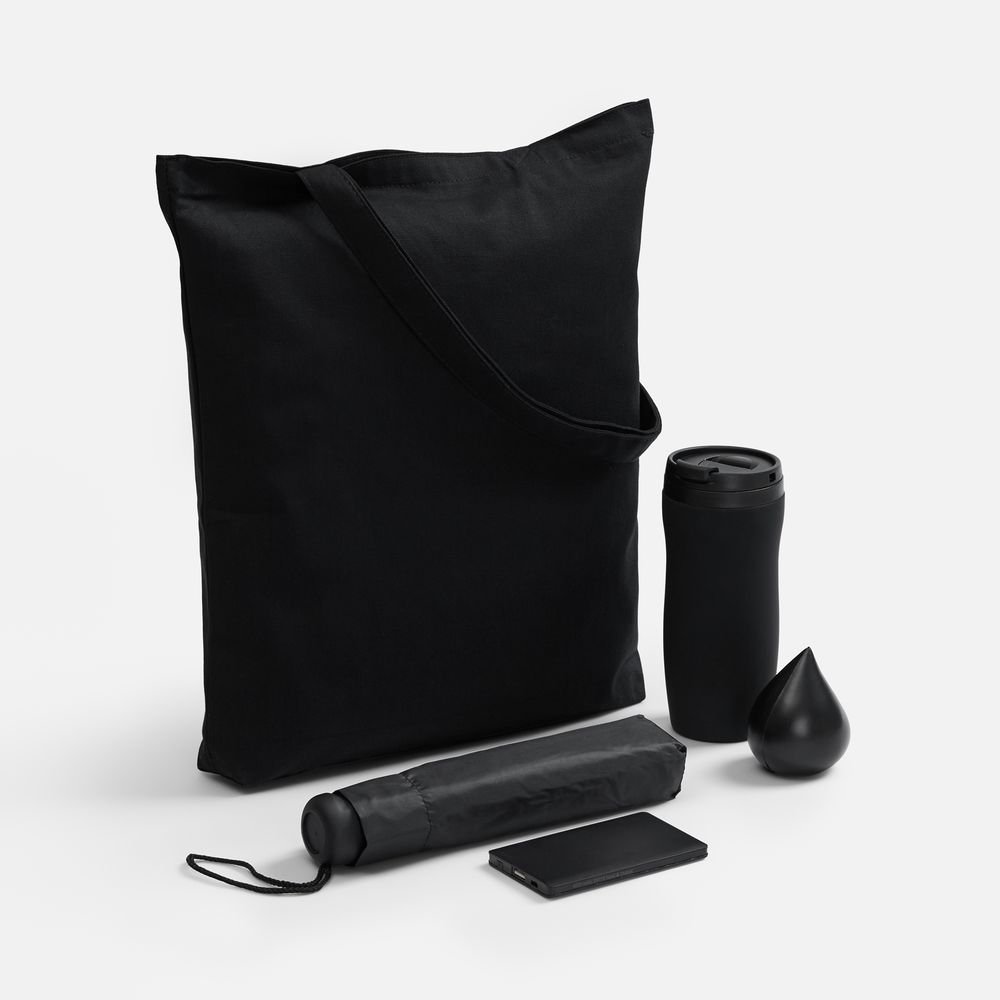 зонт - полиэстер 190T, ручка - пластик; покрытие софт-тач; каркас, спицы - металл; аккумулятор - пластик; крышка термостакана, внутренняя колба - пластик, корпус - нержавеющая сталь; покрытие софт-тач; сумка - хлопок 100%, плотность 210 г/кв.м; антистресс - вспененный полиуретан