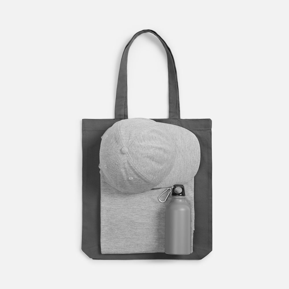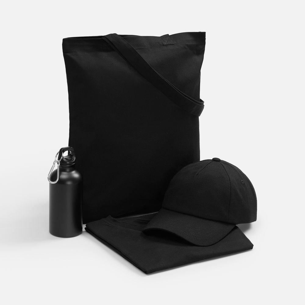 футболка - хлопок 100%, гребенная пряжа (пенье), плотность 160 г/кв.м; джерси; бейсболка - полиэстер, 75%; хлопок, 25%, плотность 170 г/кв.м; джерси; бутылка - алюминий; крышка - пластик; сумка - хлопок 100%, плотность 220 г/кв.м; саржа