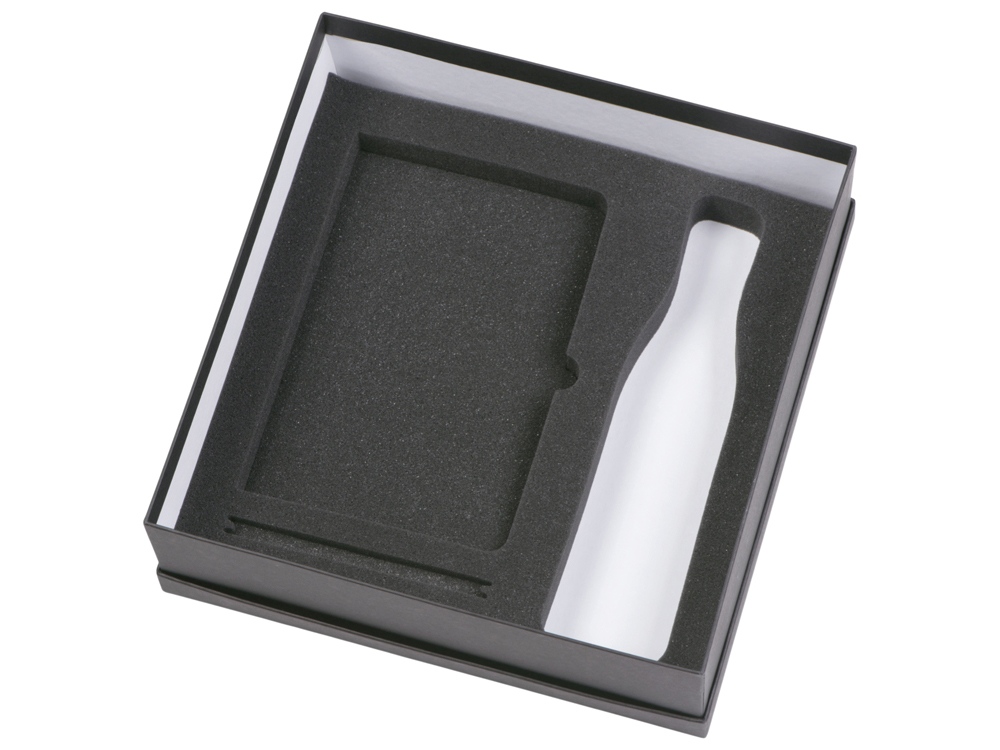 блокнот - искусственная кожа с покрытием soft-touch, ручка - алюминий с покрытием soft-touch, термобутылка - нержавеющая cталь с покрытием soft-touch, коробка - картон