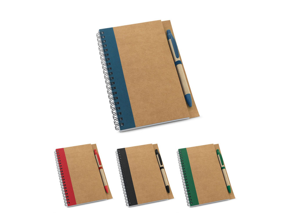 Блокнот формата B6 со спиралью с 120 страницами без линовки из вторично переработанной бумаги и твердой обложкой из крафт-бумаги. Данный набор имеет держатель для ручки и в набор входит ручка.
