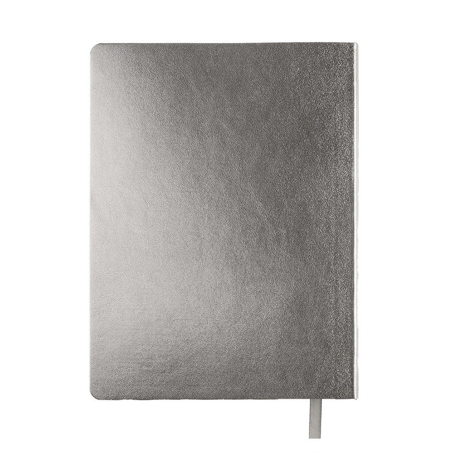 Бизнес-блокнот AURI в серебристом исполнении — сочетание современного делового стиля и премиального дизайна. Мягкий переплёт из нетермоактивного PU‑материала приятен на ощупь и визуально напоминает слиток благородного металла. Серебристый обрез страниц подчеркивает минималистичный образ, превращая рабочий инструмент в статусный аксессуар.Основные характеристики:Формат: 145×205 ммПереплёт: мягкий, из нетермоактивного PU‑материалаОбрез: серебристый, матовыйБлок: 256 страниц, кремовая эвкалиптовая бумага, плотность 70 г кв.мРазлиновка: клеткаУглы: скруглённыеЛяссе: ширина 7 ммДополнительно: перфорация на последних страницахУпаковка: черный сливбокс из переработанного картона+ бумагаВнутренний блок обеспечивает комфортное письмо и приятный визуальный контраст с серебристой обложкой. Упаковка защищает изделие при транспортировке и подчёркивает ответственное отношение к экологии. -
