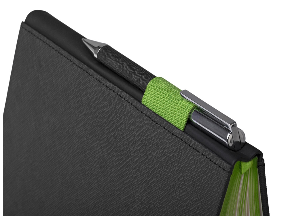 Обложка выполнена из текстурной экокожи, цветной срез и фурнитура в тон делают Bossy очень стильным бизнес-аксессуаром. Корешок из экокожи с софт-тач покрытием очень приятен на ощупь.