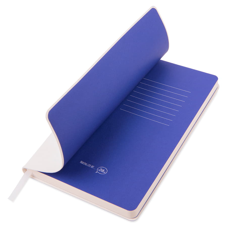 Блокнот с мягкой термоактивной обложкой и популярной комбинацией цветовТермоактивный PU материал VelvetЦвет обложки белыйЦвет форзаца, близкий к Pantone Blue UВнутренний блок 256 страниц в точкуИдеально скругленные углы блокаПерфорированные 8 последних листов Кремовая FSC бумага 70 г м2Ляссе в тон обложкиИндивидуальная упаковка: фирменный сливбокс thINKme -