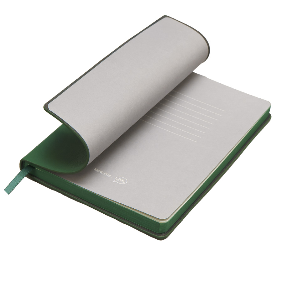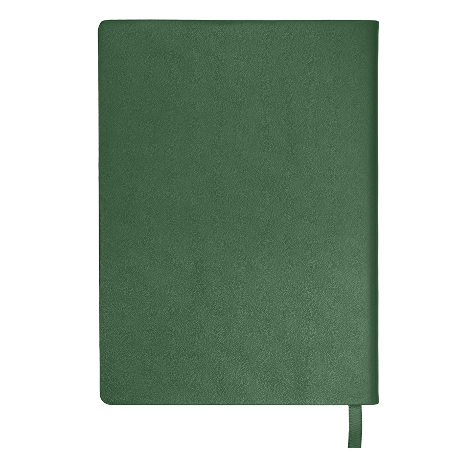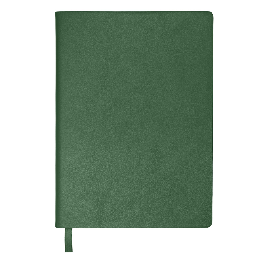 Бизнес-блокнот LADYЦвет обложки зеленый, близкий к Pantone 343CРазмер 150*210 мм, переплет мягкийОбложка - не термоактивный PU с эффектом кожи наппаБлок в клетку, скругленные углыСрез в цвет обложкиБумага кремовая, плотность 70 г м2Форзац нахцаз серый, близкий к Pantone 5 U Cool grey256 стр, перфорация на последних страницахЛяссе, 7 мм, в цвет обложкиУпаковка сливбокс + бумага -