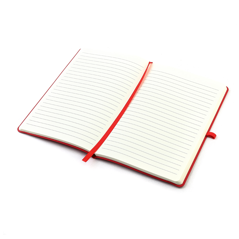 Блокнот формата А5 с мягким покрытием из PU-материала с имитацией рисунка кожи, с эластичной застежкой и текстильной закладкой, наличие петли для ручки в цвет блокнота, 192 страницы, плотность 70г/м, страницы с черными линиями. Цвет по PANTONE® (максимально приближен): 186C.- Виды нанесений: Тиснение, УФ-печать А2, Гравировка CO2-А2, Тиснение фольгой, УФ-Лак, УФ-Цвет+Лак