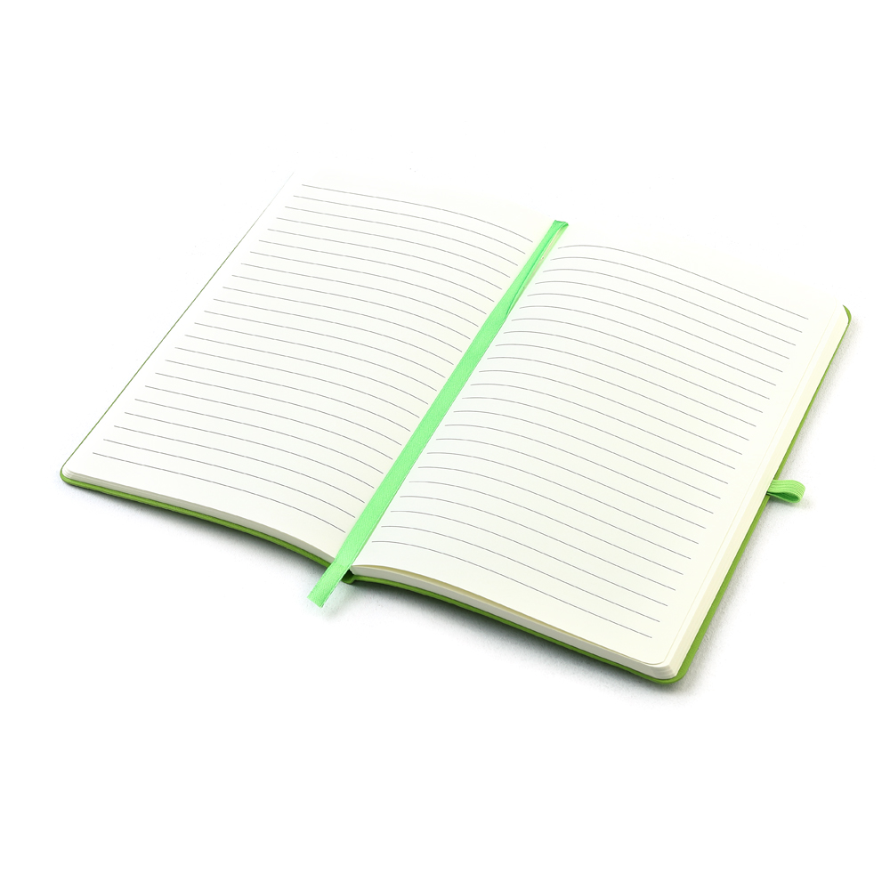 Блокнот формата А5 с мягким покрытием из PU-материала с имитацией рисунка кожи, с эластичной застежкой и текстильной закладкой, наличие петли для ручки в цвет блокнота, 192 страницы, плотность 70г/м, страницы с черными линиями. Цвет по PANTONE® (максимально приближен): 368C.- Виды нанесений: Тиснение, УФ-печать А2, Гравировка CO2-А2, Тиснение фольгой, УФ-Лак, УФ-Цвет+Лак