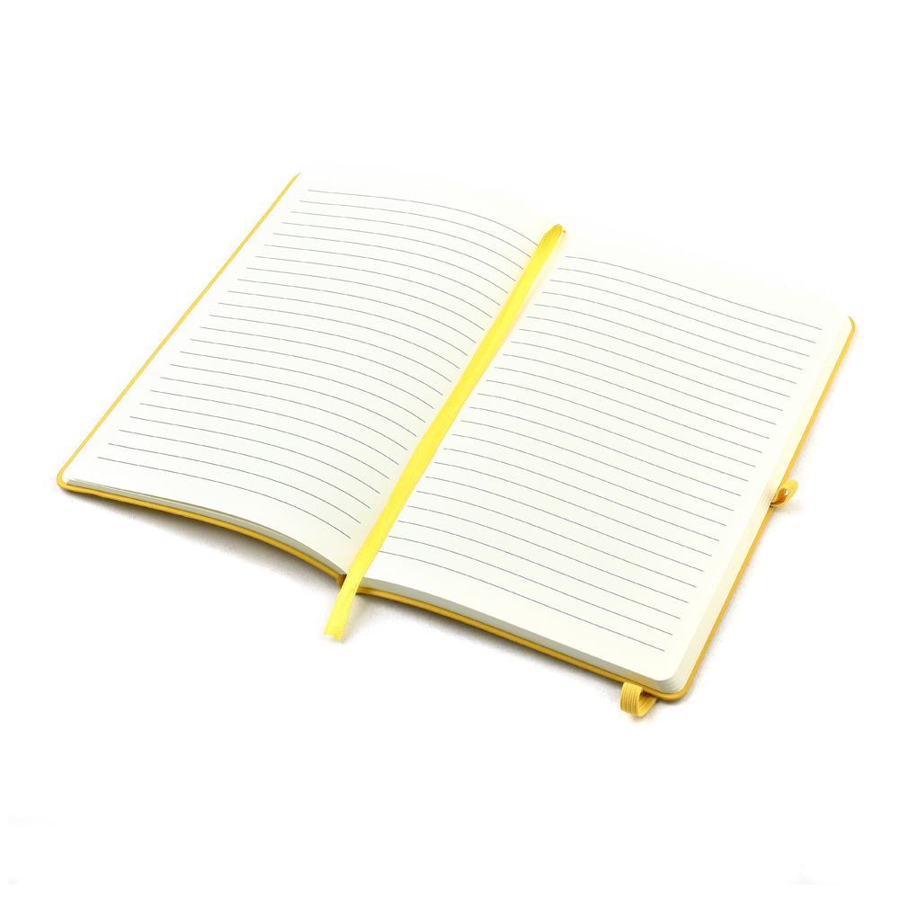Блокнот формата А5 с мягким покрытием из PU-материала с имитацией рисунка кожи, с эластичной застежкой и текстильной закладкой, наличие петли для ручки в цвет блокнота, 192 страницы, плотность 70г/м, страницы с черными линиями. Цвет по PANTONE® (максимально приближен): 109C.- Виды нанесений: Тиснение, УФ-печать А2, Гравировка А2, Тиснение фольгой, УФ-Лак, УФ-Цвет+Лак