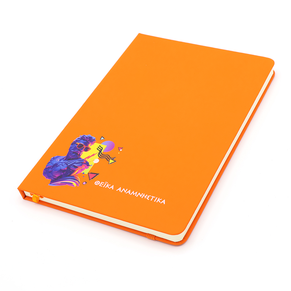 Блокнот формата А5 с твердым покрытием из PU-материала с имитацией рисунка кожи, с эластичной застежкой для закрытия и текстильной закладкой в цвет блокнота, 192 страницы / 96 листов, плотность 70г/м, страницы с черными линиями. Цвет по PANTONE® (максимально приближен): 166C.- Виды нанесений: УФ-печать А2, Тиснение, Гравировка CO2-А2, Тиснение фольгой, УФ-Лак, УФ-Цвет+Лак