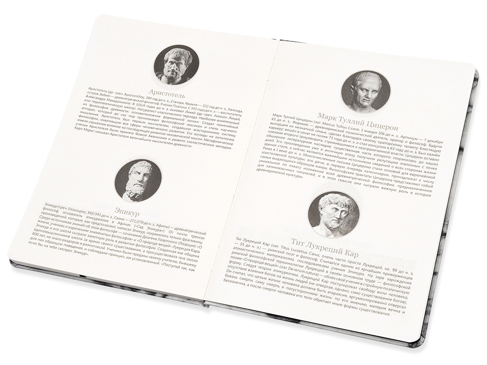 Блокнот А5 Socrates наполнен умными мыслями и цитатами великих философов. На каждой странице вы найдете ценные высказывания Диогена, Сенеки, Марка Аврелия и других гениев. В конце блокнота имеется краткая историческая справка про каждого философа с основными вехами его творчества. В блокноте 208 страниц красивой линованной бумаги и стильная закладка.