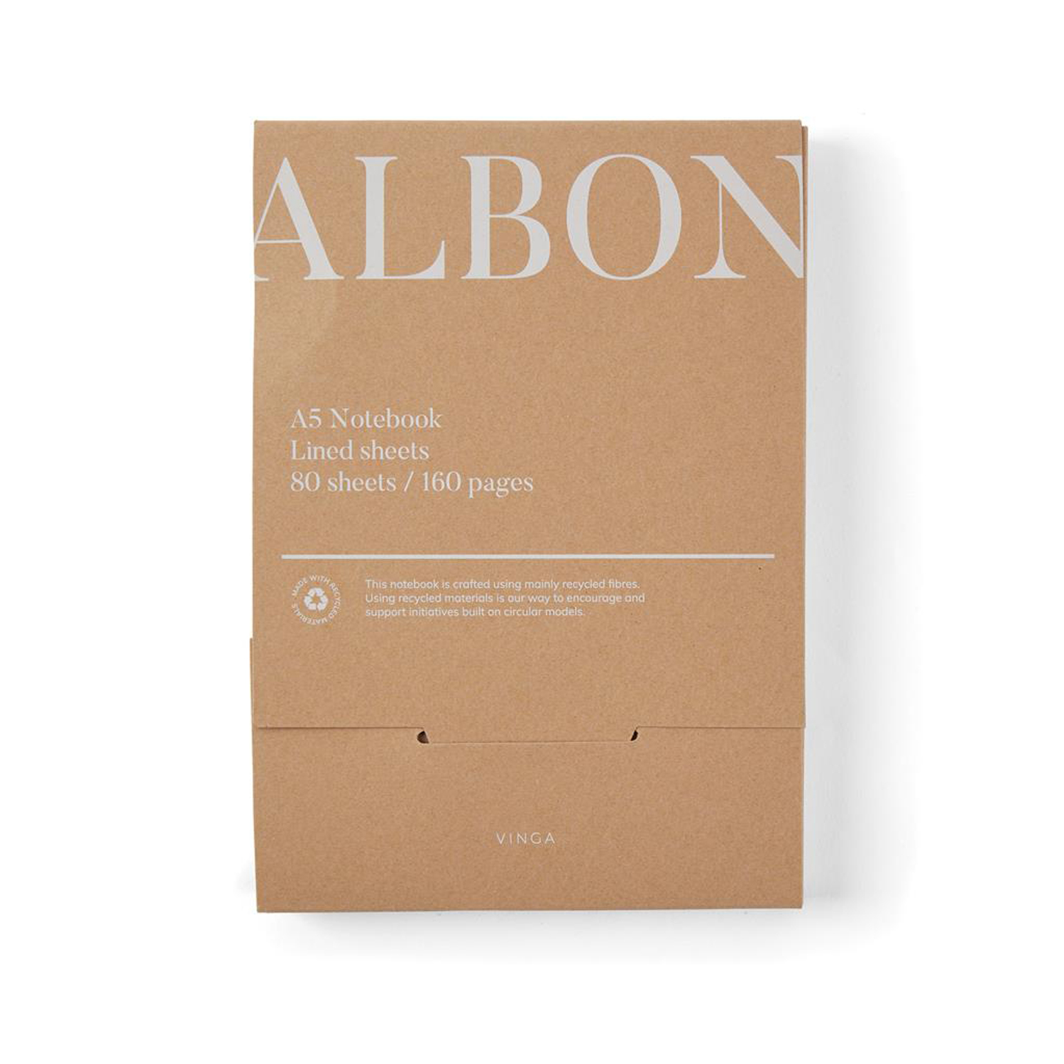 Коллекция Albon от VINGA представляет классический блокнот с мягким переплетом из переработанного фетра. Это придает ему оригинальный вид и приятную на ощупь шероховатую фактуру. Блокнот оснащен петлей для ручки или карандаша. Внутри 80 линованных листов (160 страниц) из переработанной бумаги плотностью 70 г/м2. Такая плотность отлично подходит для ведения записей и создания скетчей. Строгий, классический блокнот с интересными деталями придется по душе деловым людям и тем, кто заботится о природе. Содержание вторичных материалов: 90% от общего веса изделия. Сертифицировано GRS. Эта сертификация полностью контролирует путь поставок переработанных материалов и гарантирует их наличие в изделии.