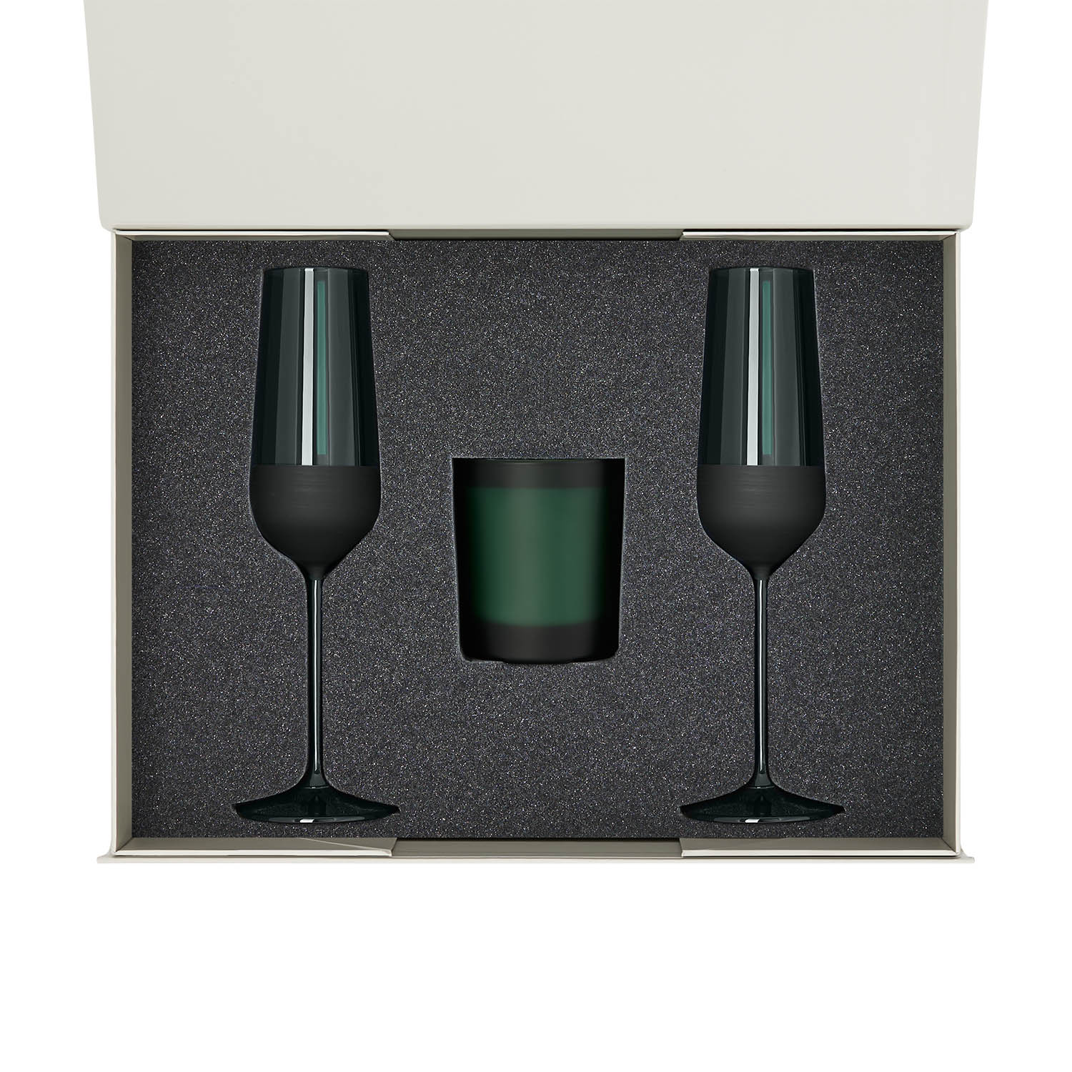 Подарочный набор свеча Enigma + 2 бокала для шампанского Emerald в серой коробке