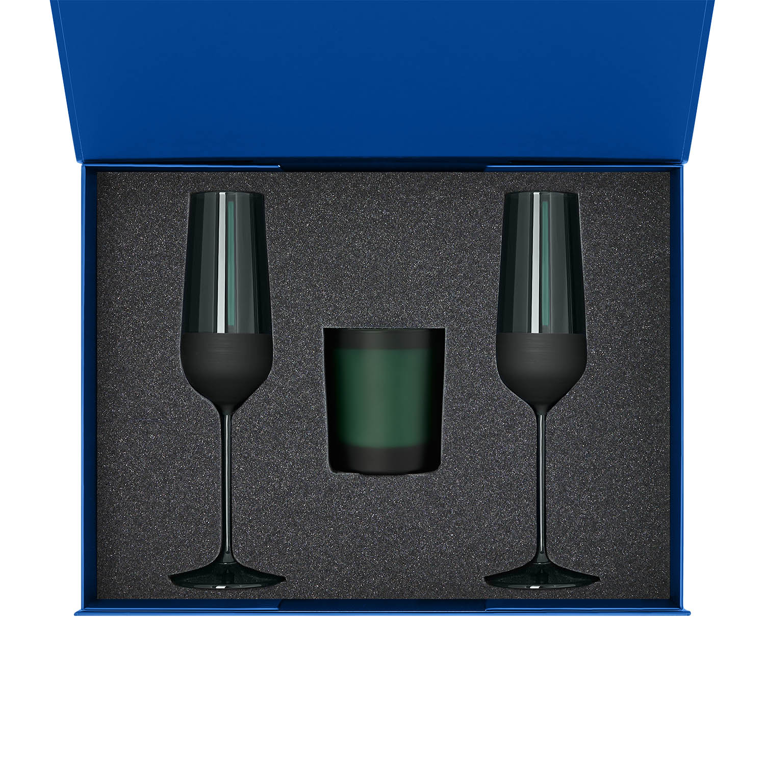 Подарочный набор свеча Enigma + 2 бокала для шампанского Emerald в синей коробке