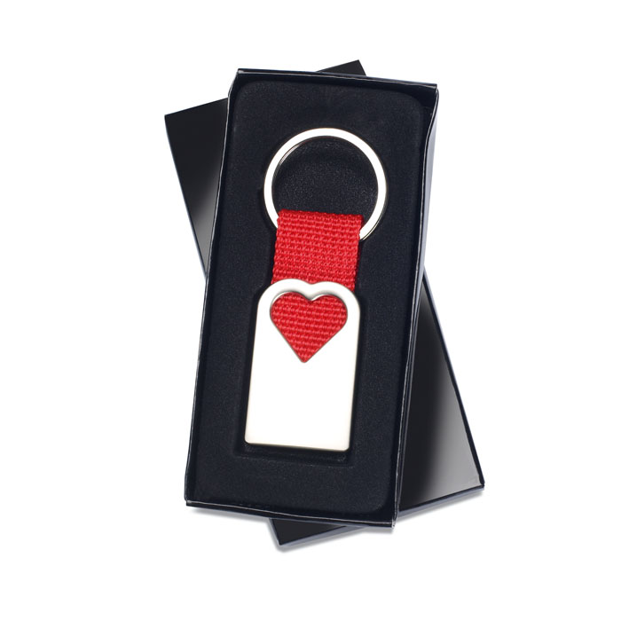 Металлический брелок для ключей с прорезью в виде сердечка и красным текстильным ремешком. -