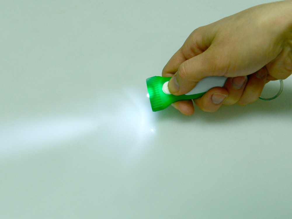 Яркий брелок со встроенным фонариком. Плоская форма и большая ручка с белой вставкой делает брелок удобным для нанесения логотипа. -