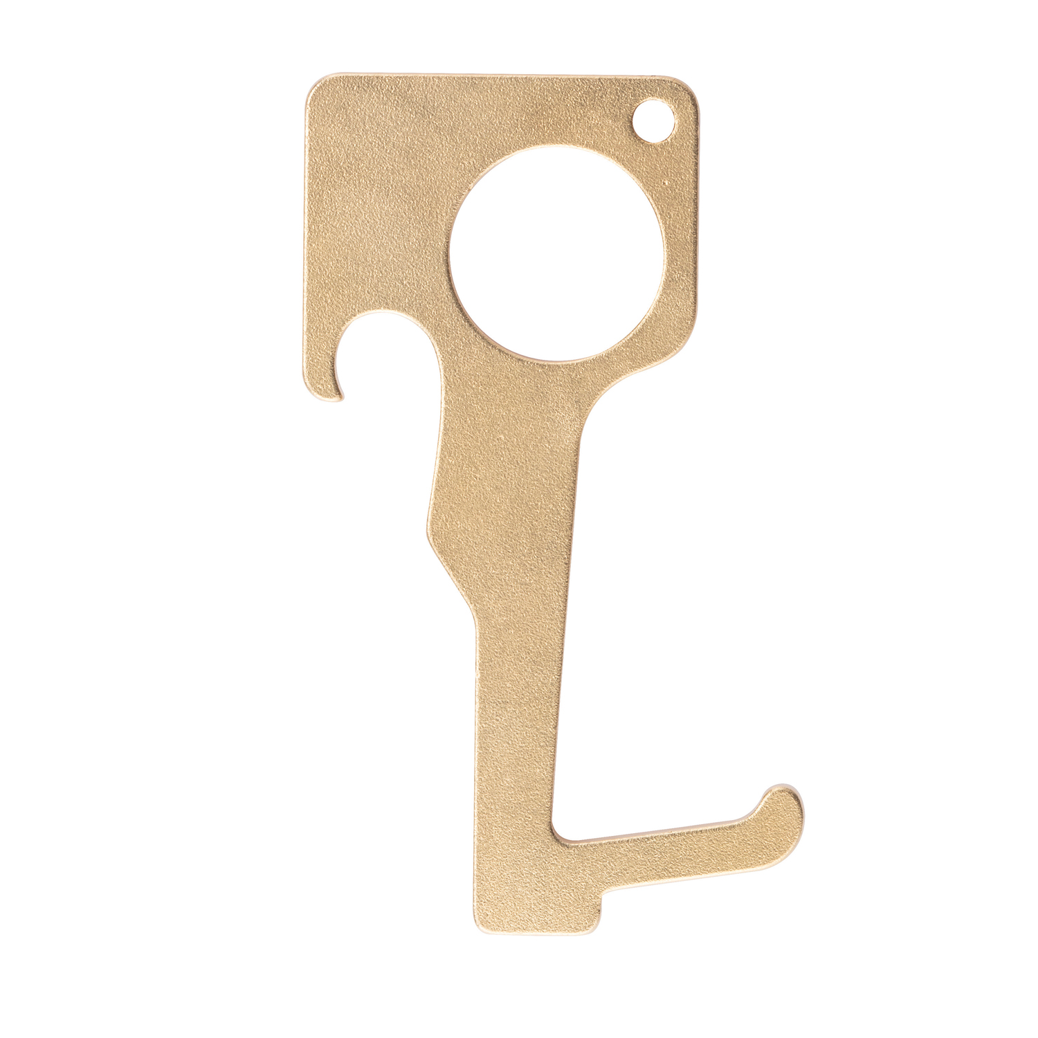 Этот брелок из латуни (62% меди и 38% цинка) позволяет бесконтактно открывать двери и избегать прикосновений в общественных пространствах, например, на кассе, в лифте или у банкомата. Латунь обладает уникальными антимикробными свойствами, поэтому 99% бактерий на этом металле не выживают. Возьмите брелок с собой, чтобы избежать лишних контактов в общественных местах, если в них нет необходимости. Также его можно использовать как открывалку для бутылок.