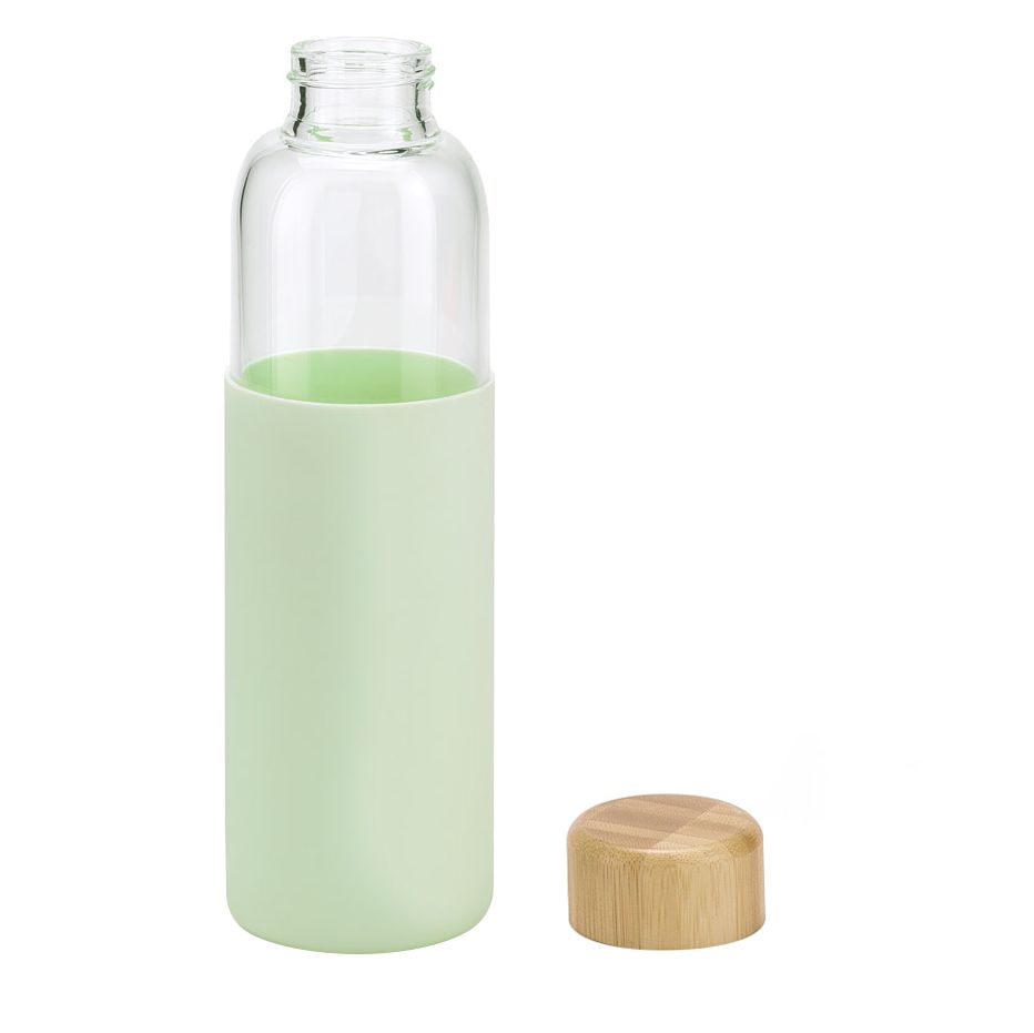 Бутылка со стеклянной колбой и крышкой из бамбука — изящное решение для тех, кто предпочитает природные материалы. Яркий силиконовый чехол защищает колбу от повреждений.- Объем 600 мл