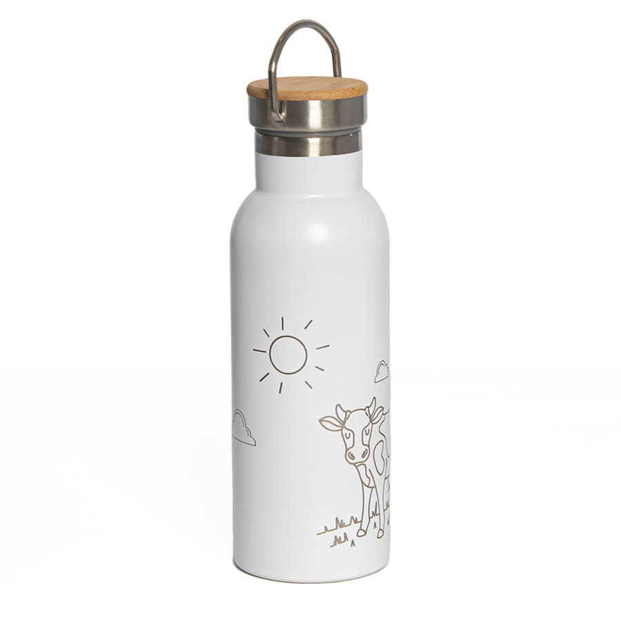 Бутылка для воды с двойными стенками из нержавеющей стали.Держатель на крышке для удобства переноски.Верхняя часть крышки из бамбука, отлично подходит для персонализацииБлагодаря двойным стенкам, температура напитка в бутылке будет в полной сохранности на протяжении 2-3 часов.Индивидуальная упаковка - коробка из крафтового картона -