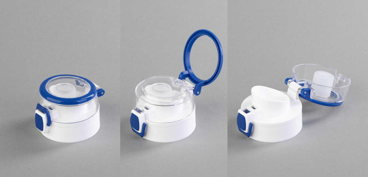 Удобная система открытия, не нужно ничего крутить, достаточно нажать кнопку. Угол открытия крышки более 180º, так она не мешает при питье.